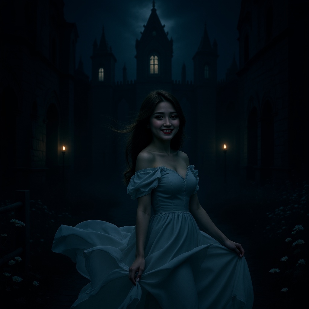 Change the background to a dark, eerie haunted castle with gothic architecture, cracked stone walls, flickering lanterns, and dense fog. Adjust the lighting and shadows on the girl so they match the ominous mood of the new background — cool tones, directional lighting from the castle, and subtle atmospheric glow. Keep the girl's pose and expression intact, but ensure overall harmony between subject and environment.