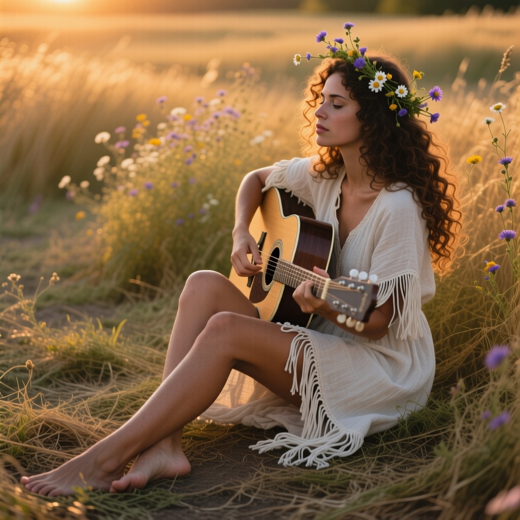 realism, a woman with healthy tanned skin and natural long curly hair, with a few wildflowers woven into it. She wears a fringed, off-white linen dress and sits barefoot in a golden field at sunset, holding a guitar. The lighting is warm and soft, creating a free-spirited and romantic atmosphere, photorealistic, golden hour lighting.