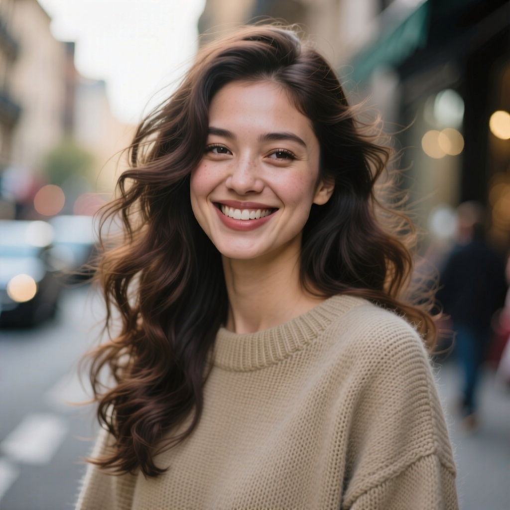 A close-up portrait of a stylish woman with wavy, dark brown long hair and a warm smile, wearing a beige cashmere sweater. The background is a blurred city street with a soft bokeh effect. Natural afternoon light, cinematic, photorealistic, high detail, 8K.