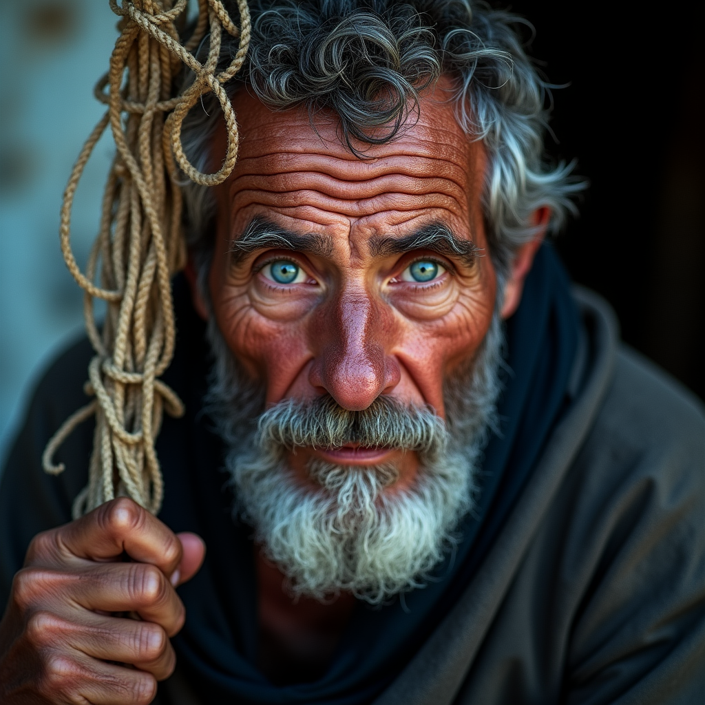 Studio portrait with dramatic chiaroscuro lighting, deep shadows, Renaissance painting influence.