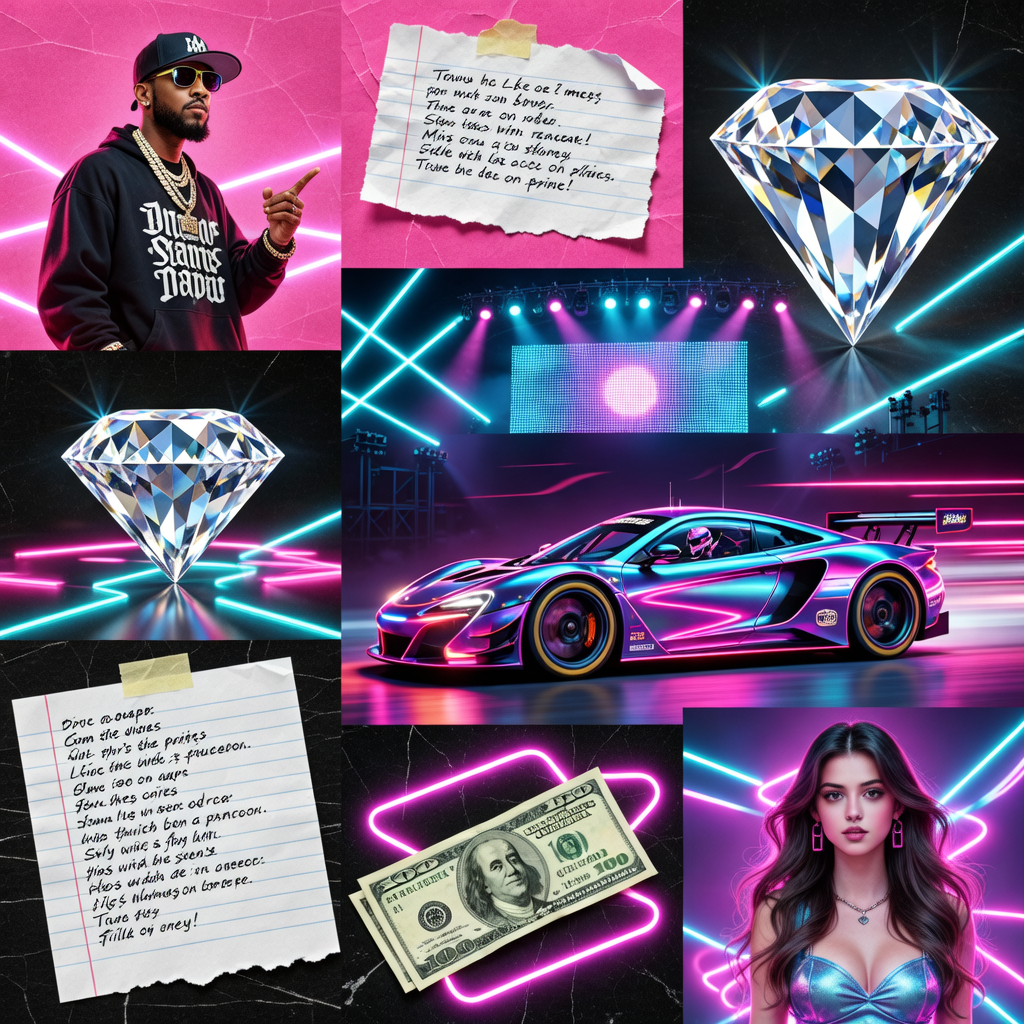 A mix collage with rapper, diamond, concert, neons, scratch paper, lyrics on paper, racing cars, money, and girls with a futuristic vibe