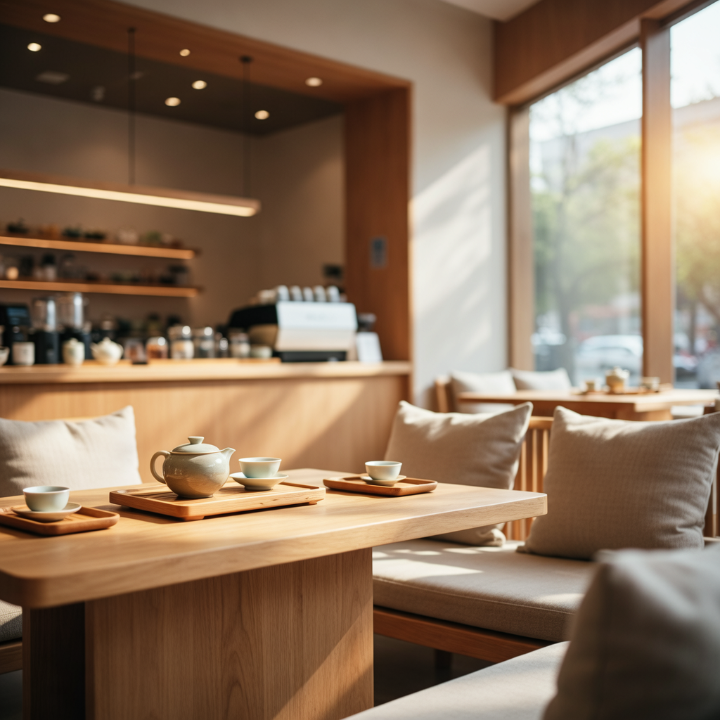 A modern tea shop interior, warm afternoon light, minimalist wood design, cinematic photography, medium shot, shallow depth of field, 35mm look, clean lines, natural shadows, soft highlights, cozy seating, neatly arranged tea bar, high detail