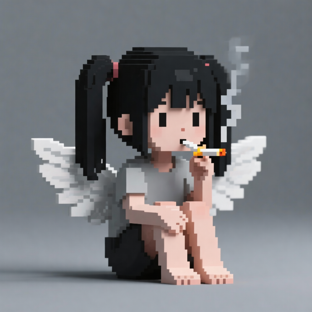 a small girl with black twin-tail hair, sitting with her legs drawn together in front of her, smoking a cigarette, angel wings attached to her back, gently fluttering, flat solid gray background, no gradient, uniform monochrome, 3D pixel art style, voxel art, blocky geometry, anime-style character design, stylized proportions, minimal facial detail, low-resolution yet three-dimensional pixels, minimalistic composition, quiet and subdued mood, slightly surreal atmosphere, cinematic framing, soft but gloomy lighting --ar 58:77 --video 1
