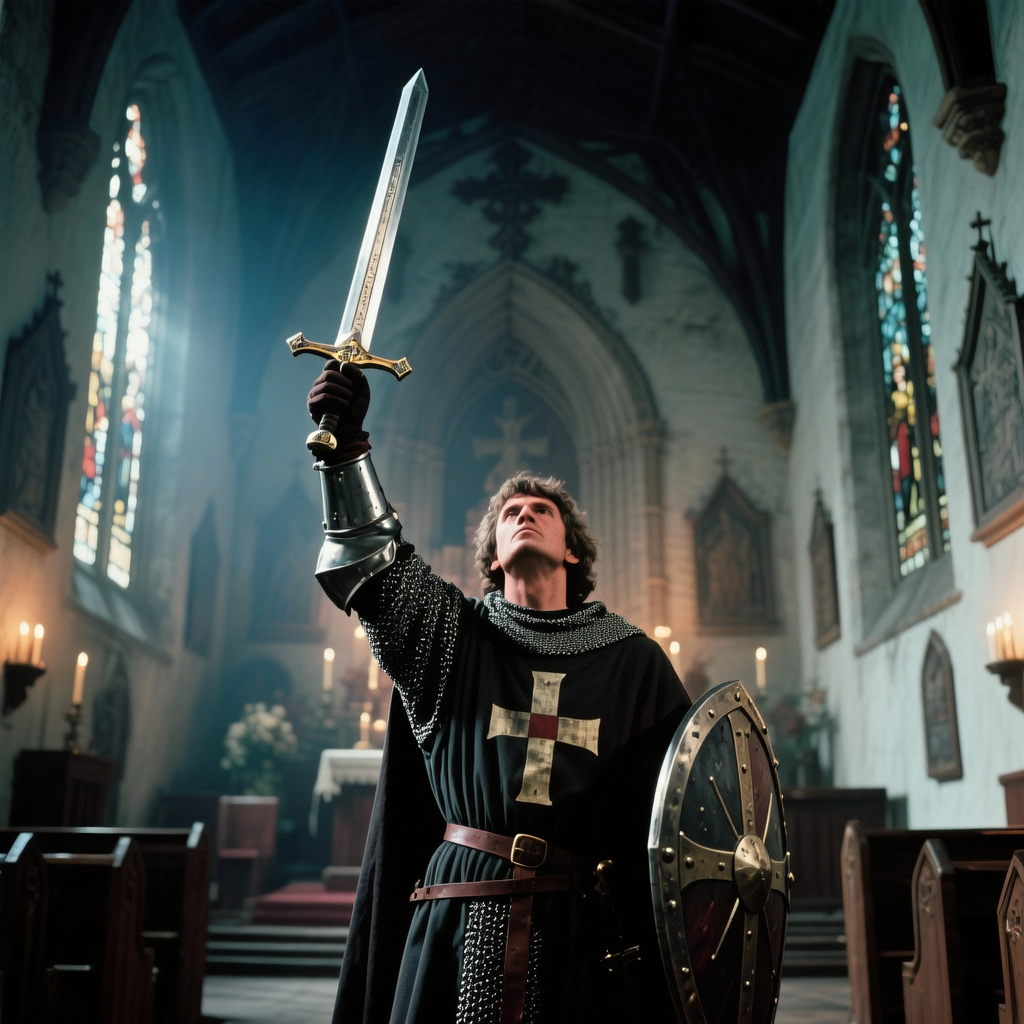 dark fantasy 1980s DVD screengrab of a crusader raising his sword in a traditional early middle ages church ar 3:2 --ar 1:1