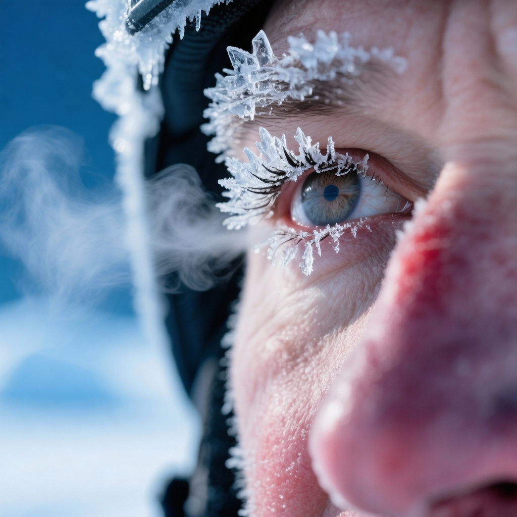 An extreme close-up documentary shot of a human face in brutal Arctic cold, eyelashes completely frozen and coated in thick ice crystals, frozen breath crystallizing in the air, skin slightly red from negative 50°C temperatures, hyper-realistic cinematic lighting, shallow depth of field, every frost particle sharply detailed, realistic cold blue color tones, shot on an ARRI Alexa 65 with a macro lens, natural film grain, Netflix-style documentary realism.