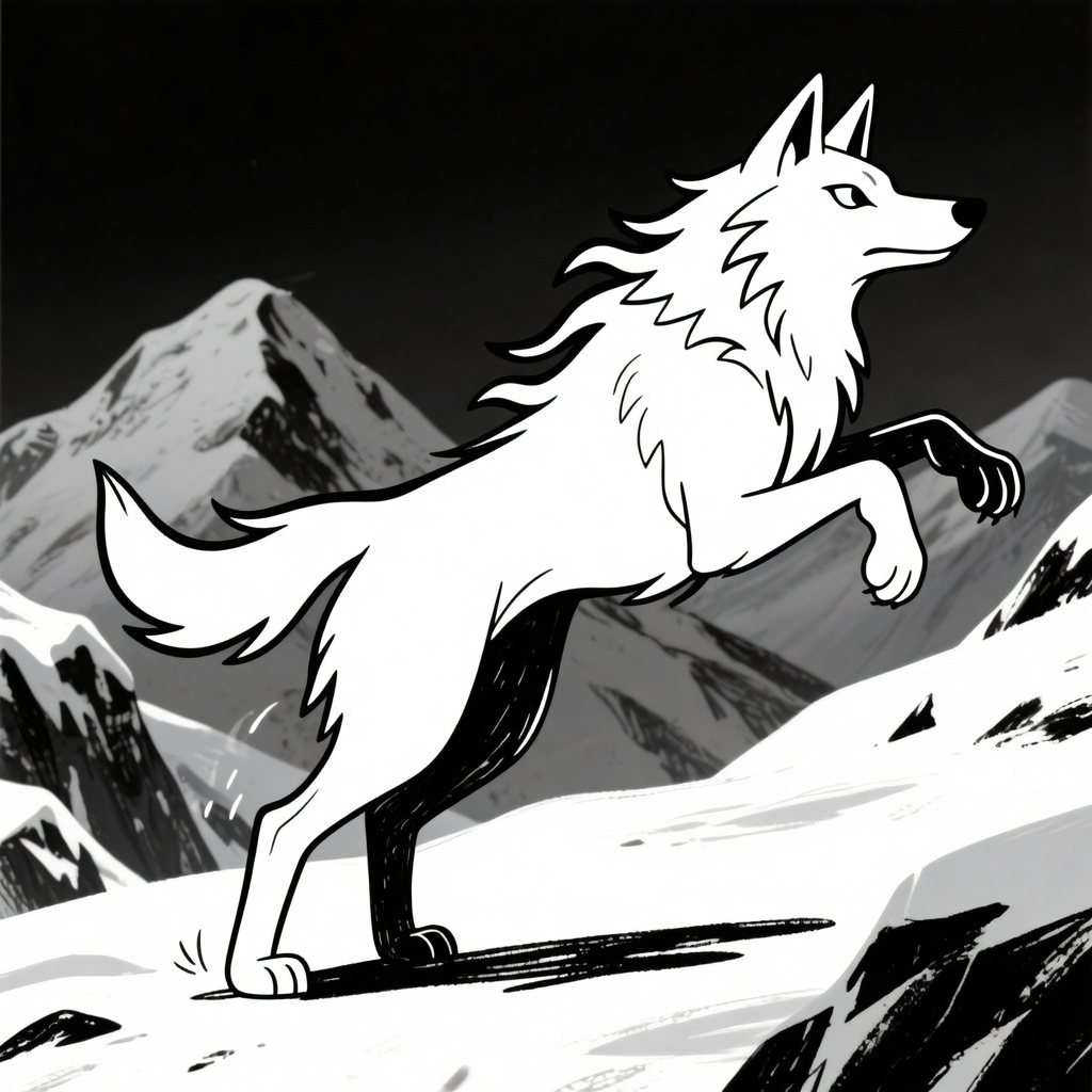 Jumping wolf motif that is one colour. The wolf is in similar style as Jankovics Marcell's Fehérlófia. As the wolf body looks like as flames. the wolf, standing in a snowy mountain landscape, minimalist ink sketch style, black and white only, sharp eyes, calm but tense posture, hand-drawn animation look, no fur details, abstract form, high contrast, rough texture --ar 1:1