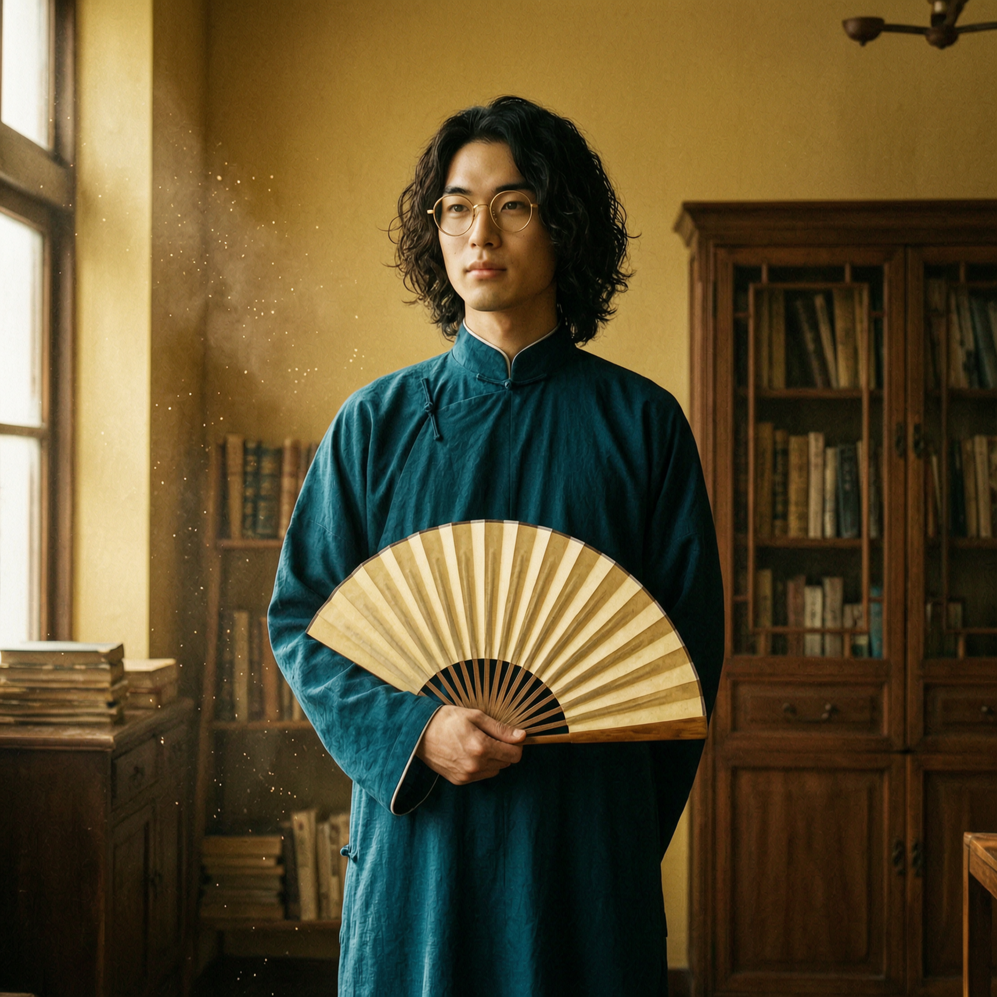 ![[Basic Facial Description] The character's appearance is based on Reference Figure 1, wearing a dark cyan long gown, round gold-rimmed glasses, and holding a folding fan. The background is an old Shanghai study room with wooden bookshelves, warm yellow tones, vintage film texture, soft side lighting, dust particles dancing in the light beams, cultural atmosphere, quiet and restrained. Shot on Hasselblad medium format, 85mm lens, high resolution, cinematic color grading, Wong Kar-wai style.
