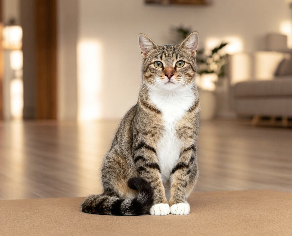 cozy indoor living room, soft furniture textures, warm natural light, seamless integration with cat, realistic photo style