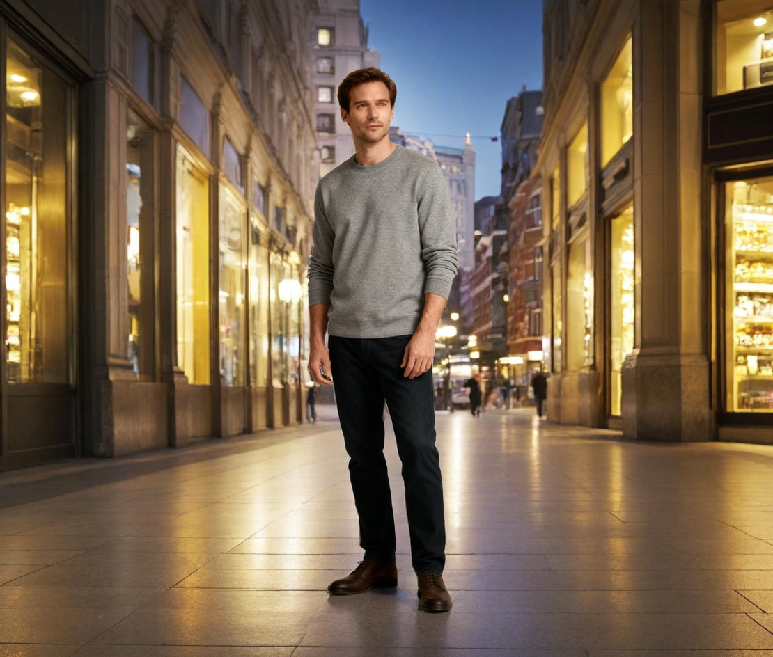 urban city street at dusk, detailed buildings, warm street lights, soft shadows, realistic integration, high-resolution photo style.