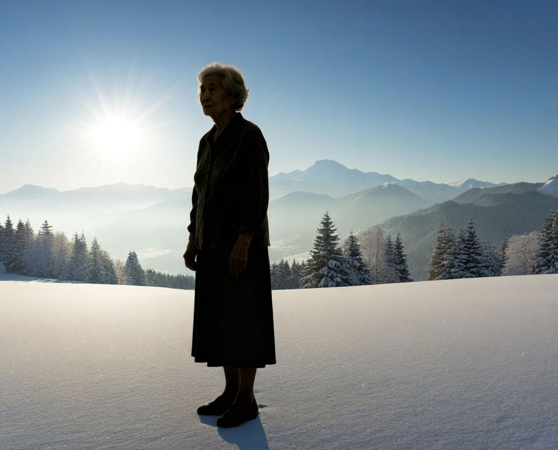 snowy mountain landscape, clear sky, detailed snow textures, soft shadows, seamless integration with subject, realistic photo style.