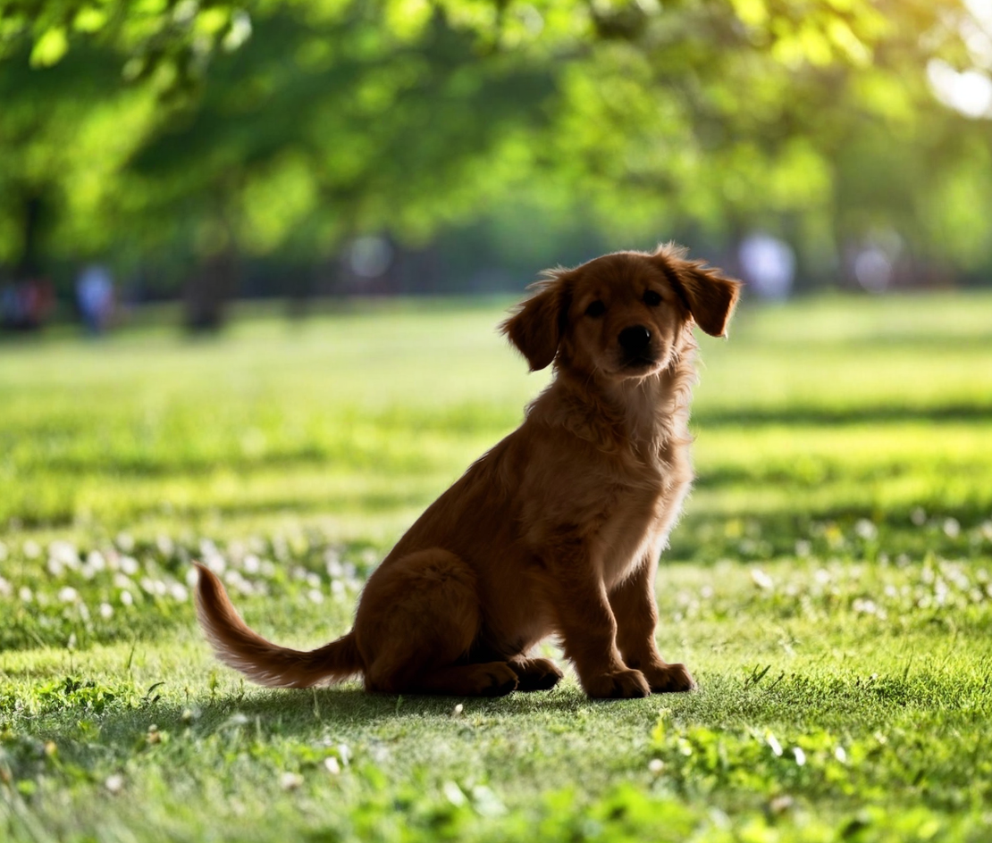 grassy park with flowers, bright natural sunlight, detailed grass and flowers, smooth integration with dog, realistic photo style.