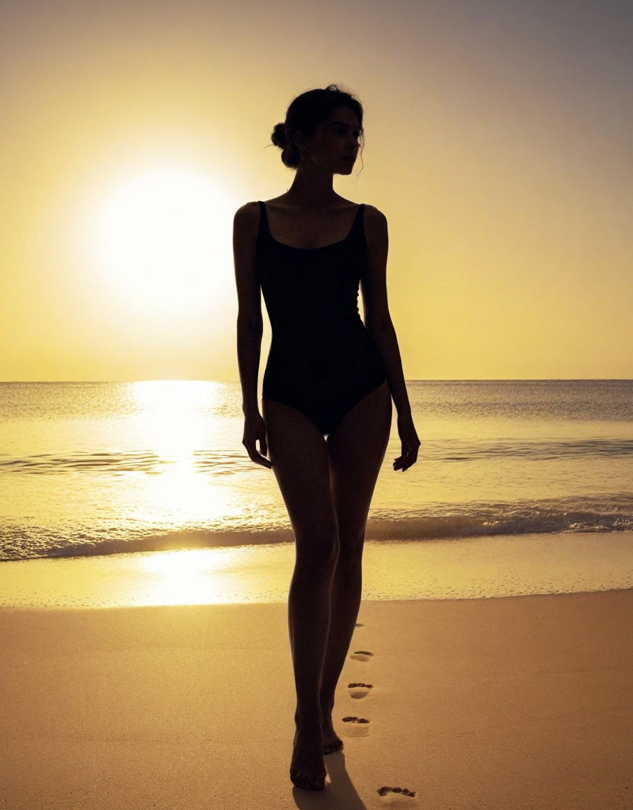 tropical beach at sunset, soft waves, golden sand, warm natural light, seamless integration with subject, realistic photo style.