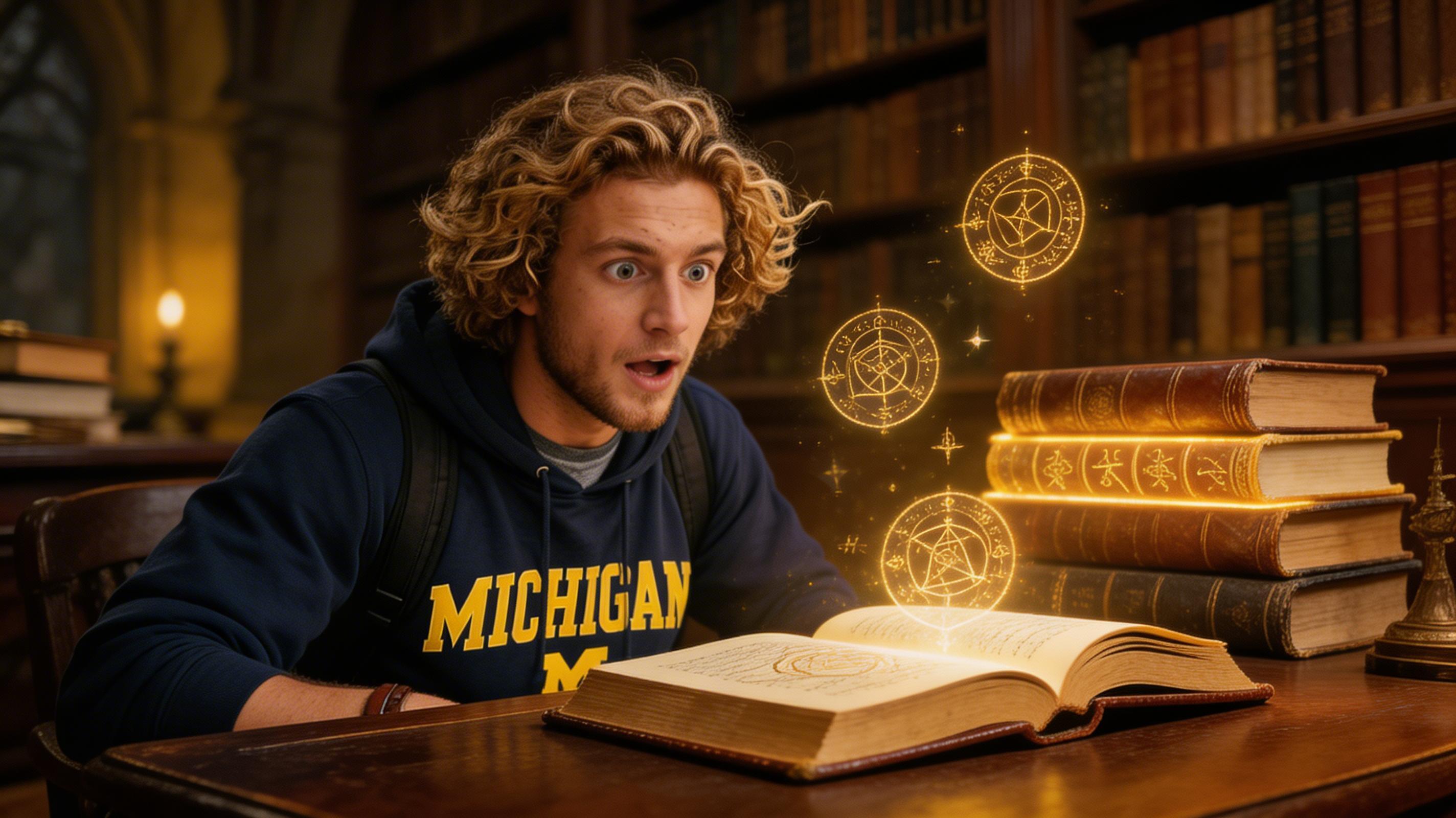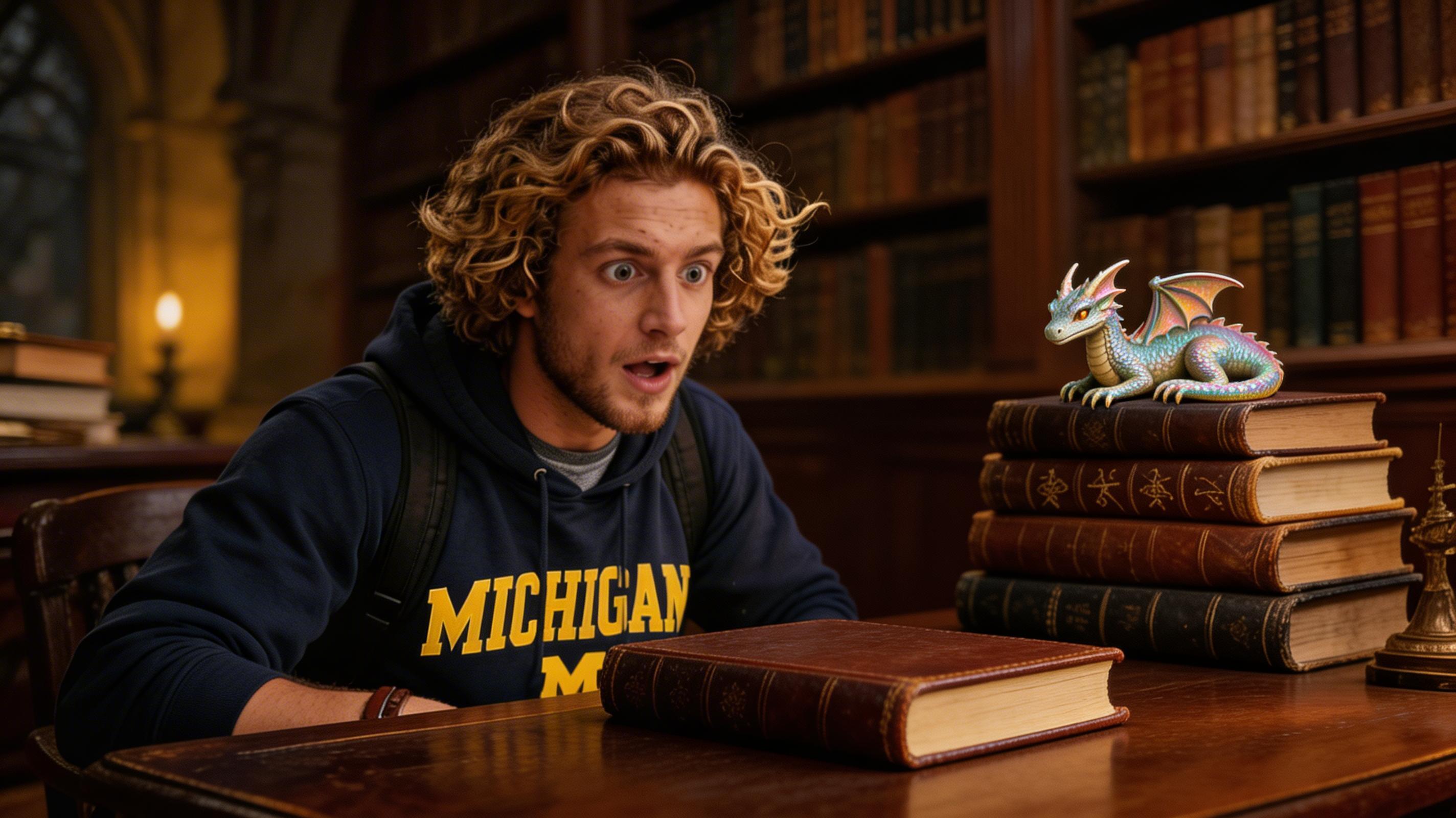 2 images. First, The same young man sitting at the desk, but the books behind him start glowing with golden magical light, ancient runes floating out of the open book, his eyes wide with surprise, Harry Potter aesthetic, cinematic. Second, The young man back in the library, book closed, looking shaken at a tiny dragon sleeping on the stack of books beside him, warm cozy lighting, magical realism