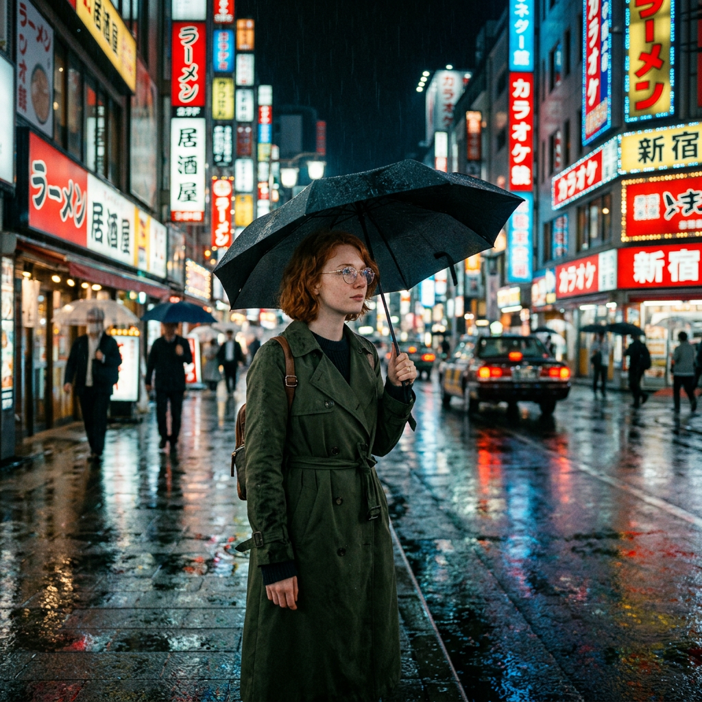 A young woman with short red hair and round glasses wearing a dark green trench coat, standing in a rainy Tokyo street at night. Neon signs reflected in puddles. Cinematic still, anamorphic lens look.