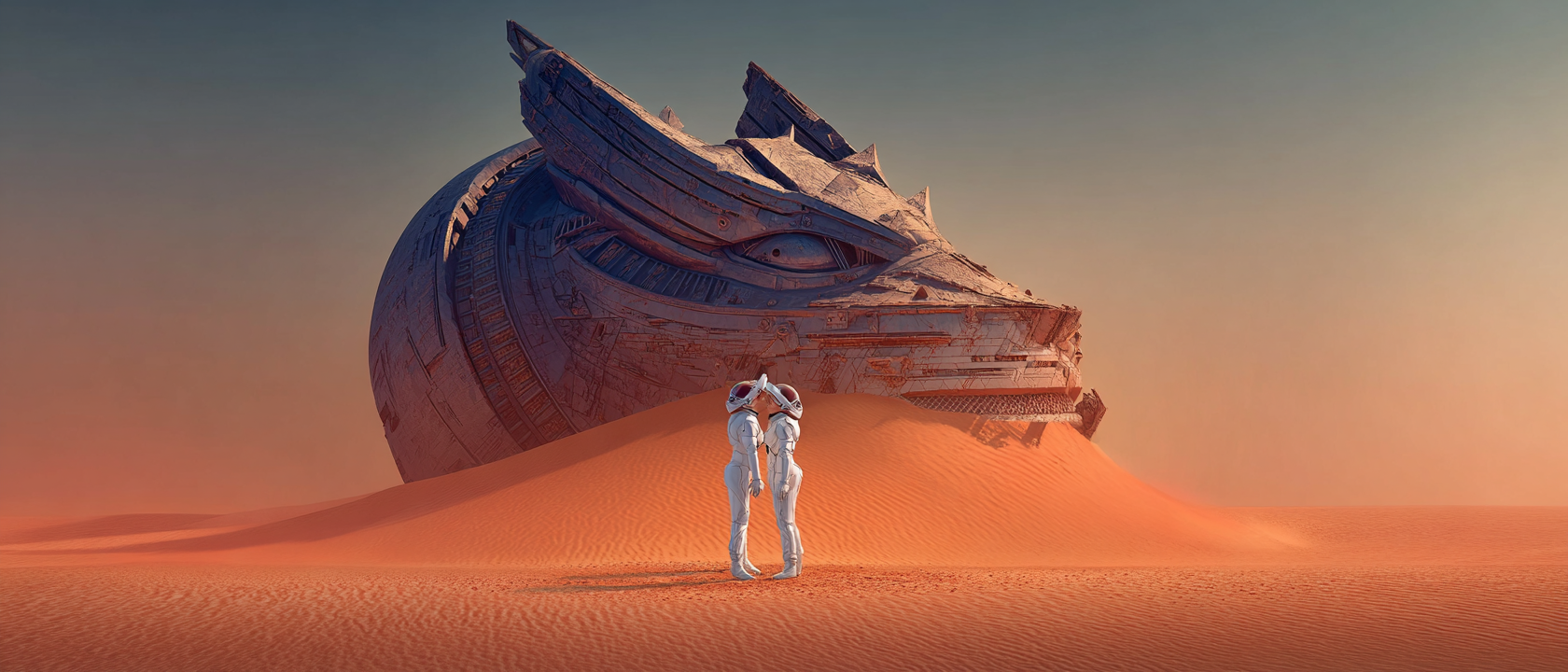 Herd of colossal, ancient creatures resembling walking mountains made of rock and sand, trekking across golden dunes. Drone shot from above, photorealistic cinematic lighting, sense of scale.