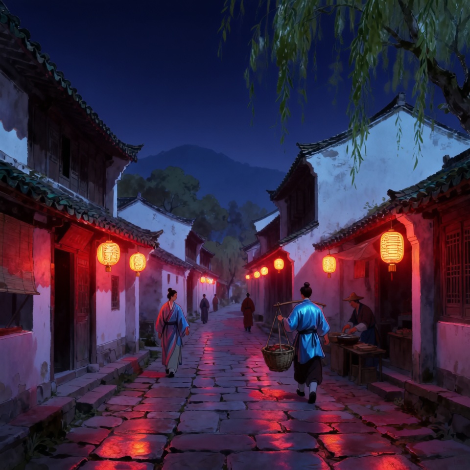 Preserve the layout of the ancient town — the cobblestone street, tiled roofs, and hanging lanterns — but reinterpret them through a futuristic neon aesthetic. Replace the red lanterns with glowing holographic signs emitting soft pink and cyan light. The buildings retain their original forms yet now feature metallic surfaces, subtle reflections, and illuminated panel seams.
