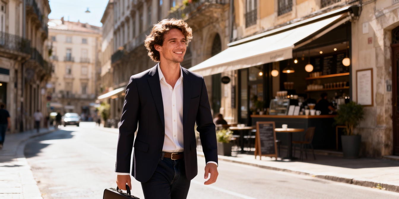 Shirt & Backpack: His current gray shirt and backpack seamlessly transition into a tailored, dark navy suit jacket and a crisp white dress shirt. The backpack should dematerialize or be replaced by a sleek, minimalist leather briefcase held in his left hand (viewers' right).