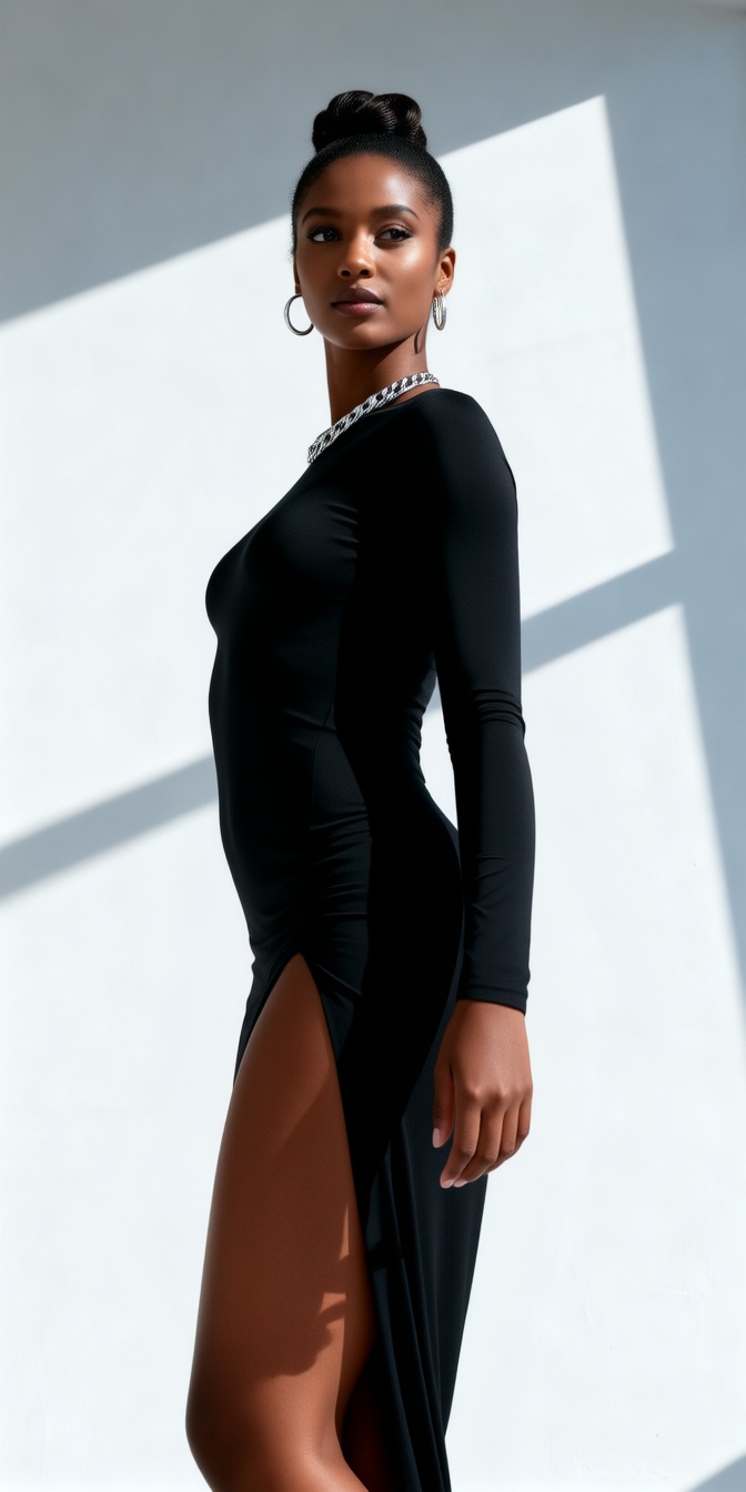 Dress Dynamics: As she turns, her black dress, especially the slit portion and the gathered fabric on the hip, should show realistic, flowing movement and subtle shifts in folds and wrinkles.