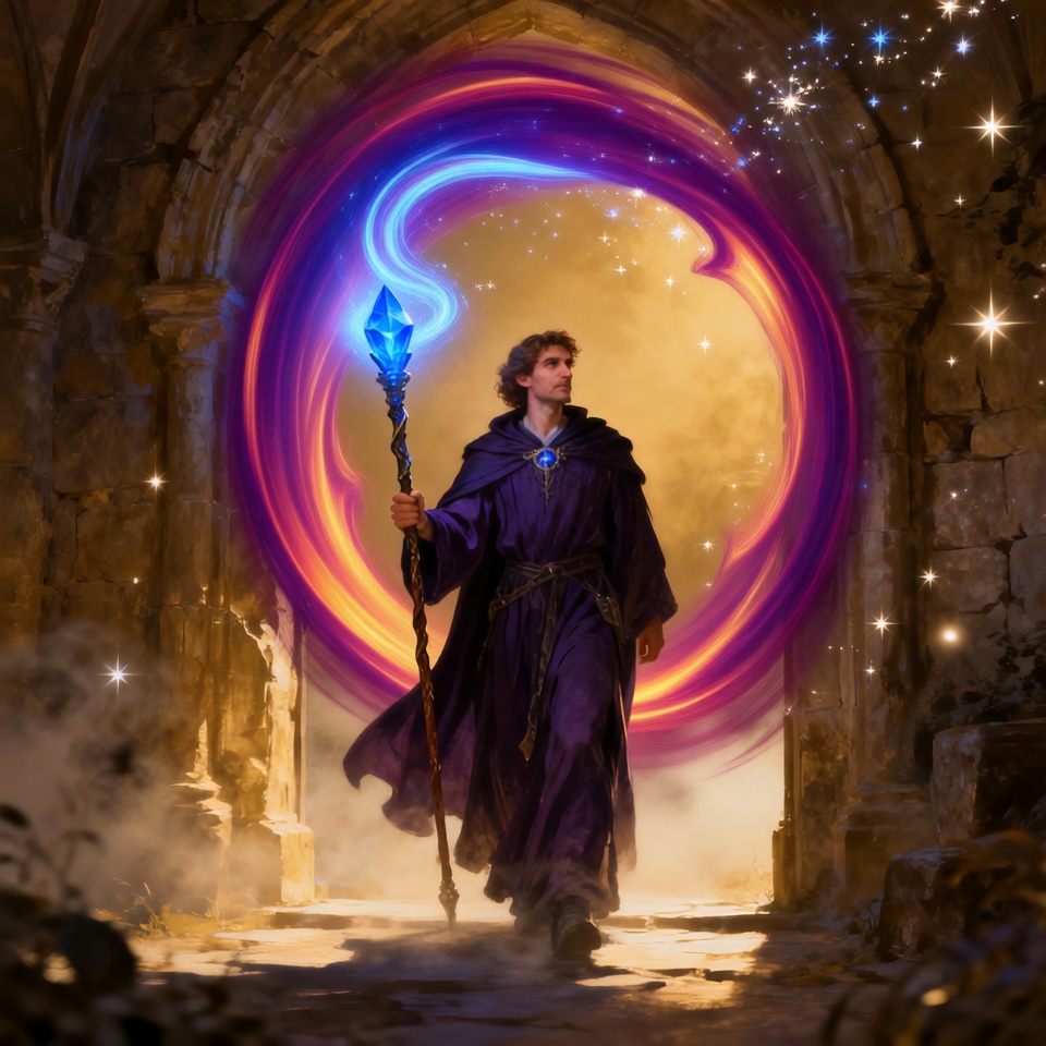 The Wizard: The wizard's robes and beard must be violently whipped forward by the portal's suction. The staff's magic flares intensely as a shield, pushing back against the vortex.