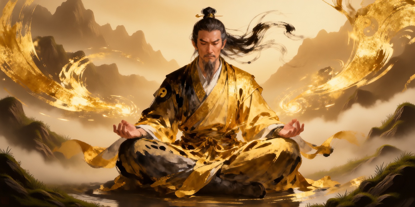 Ink to Reality: The abstract black ink swirls and golden strokes in the background gradually coalesce and transform into a highly detailed, realistic, serene natural landscape (e.g., misty mountains, flowing rivers, ancient trees). The transition should be like ink dissolving to reveal a hidden painting.