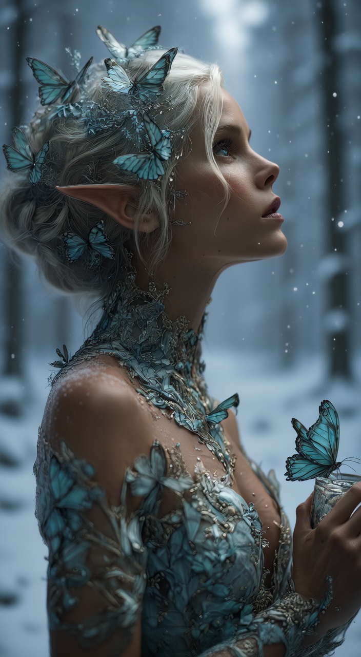 Butterfly Reaction: The blue butterflies in her hair and on her dress begin to glow with a faint, inner warmth (a magical reaction) and slowly flap their wings as if trying to stay warm.