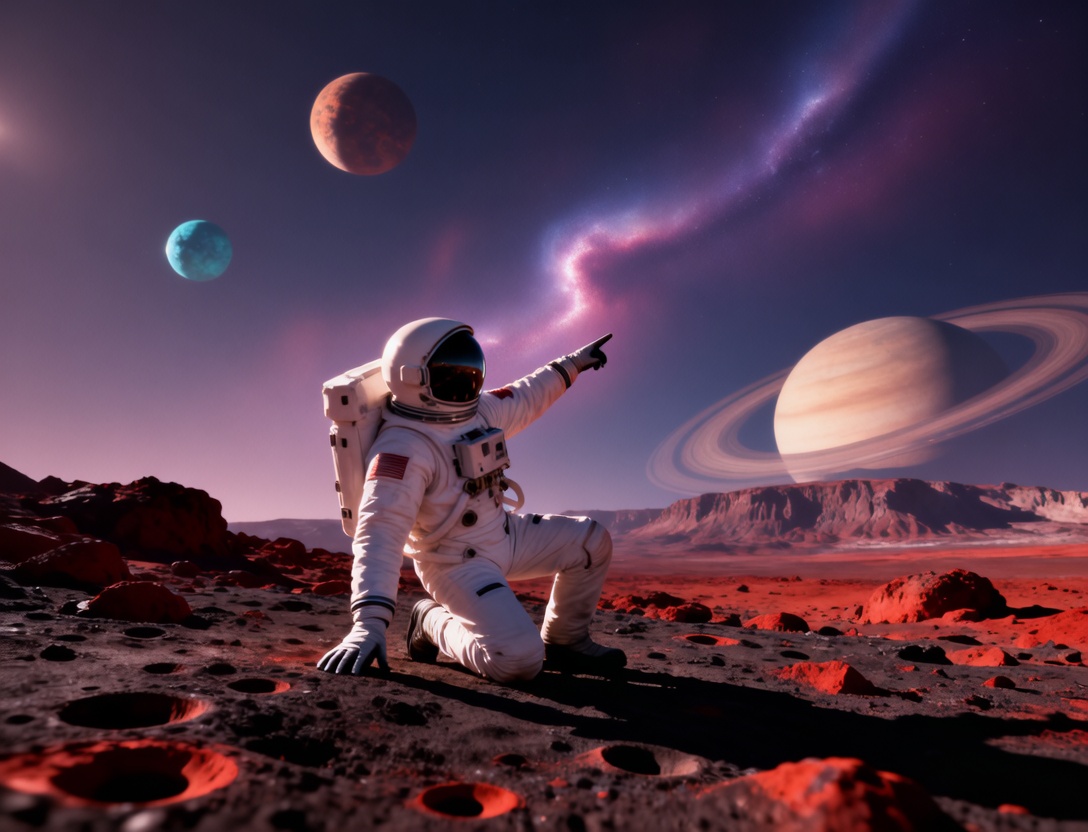 Convert this astronaut scene into a surreal dreamscape with glowing nebula skies, ethereal colors, and soft painterly textures
