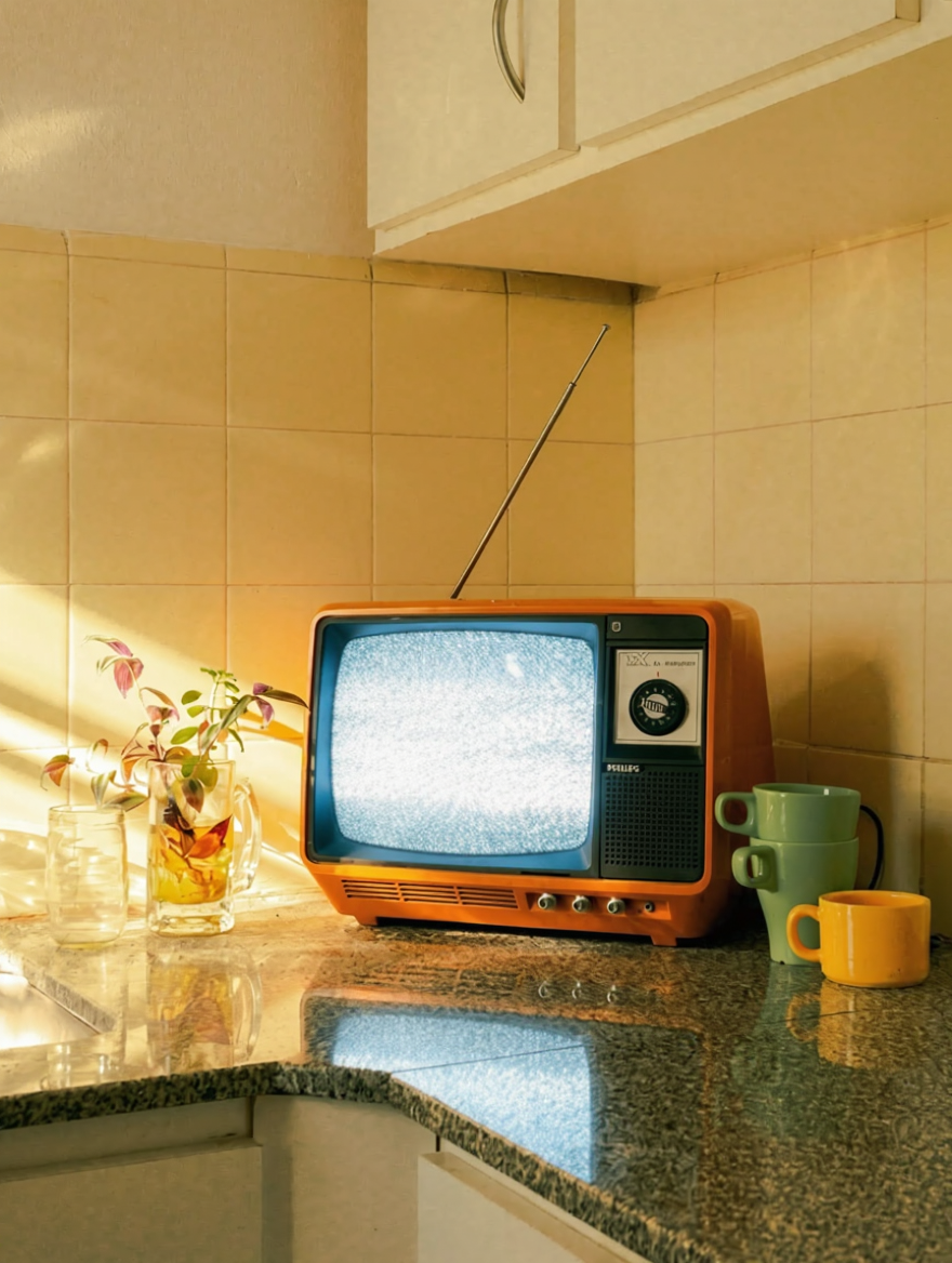 Write the global prompt In the prompt field, describe the overall scene and motion in one or two sentences (for example: TV screen flickering, reflections on the counter, slight handheld camera feel).