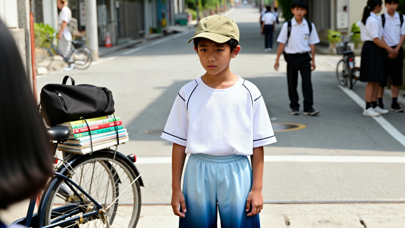 Keep the boy, his pose, facial expression, white T-shirt with black trim, black shorts, and the entire scene composition unchanged. Add a khaki-colored baseball cap on his head (matte cotton, slightly tilted forward, natural fit). Replace the black shorts with smooth gradient blue long pants (light sky blue at top fading to deep navy at bottom, soft fabric texture). Keep the black backpack with books and black cap on the bicycle unchanged. Maintain original lighting, skin tone, background students, bicycle, and photorealistic detail, 8K resolution.