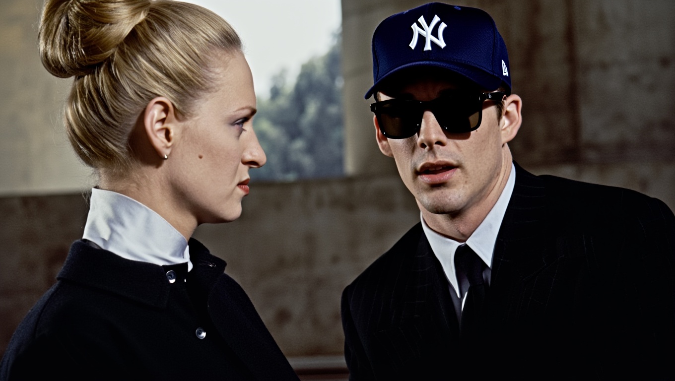 change the man's suits in the image 2, intage film portrait, soft lighting, classic 1950s glamour, smooth skin texture, cinematic mood