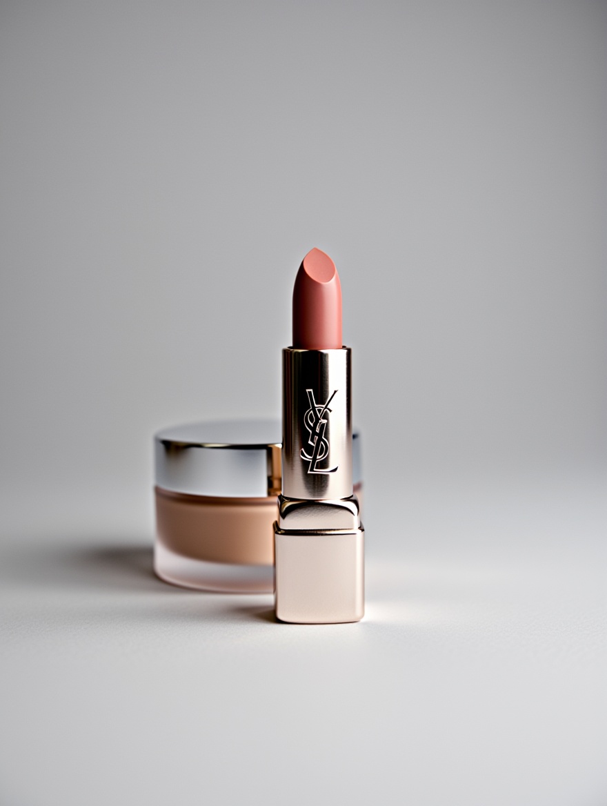 A clean, modern beauty product advertisement poster featuring a luxurious lipstick and matching cosmetic items arranged together in an elegant composition. The scene has balanced framing with ample negative space, soft studio lighting, and a minimalist solid light grey background. The products are glossy, high-end, and precisely detailed. High-resolution professional product photography aesthetic, refined and contemporary style.