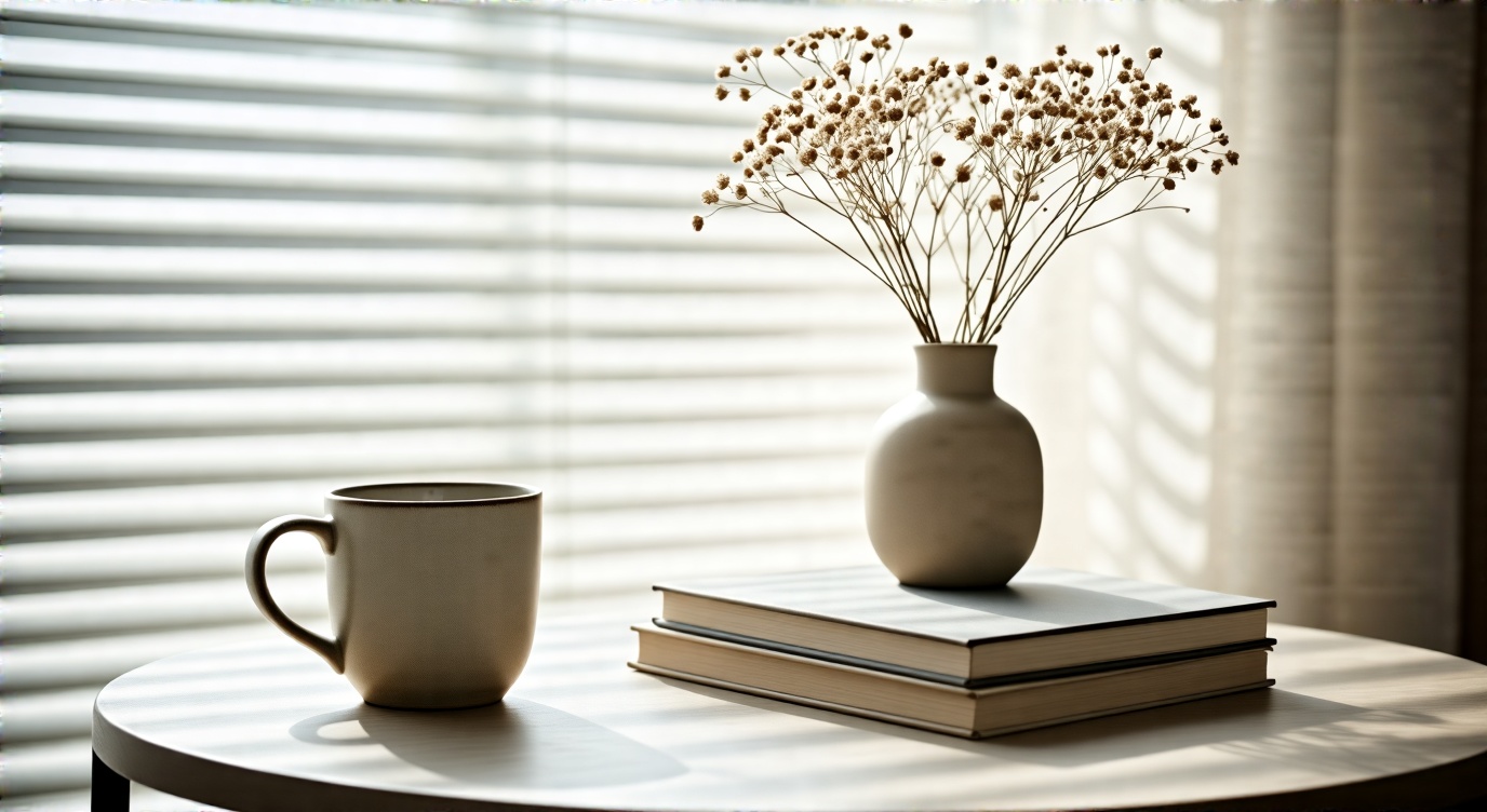- Combine both references into one coherent scene. The character crosses the room, interacts with the cup, subtle cloth movement, soft shadows, realistic contact with the table surface.