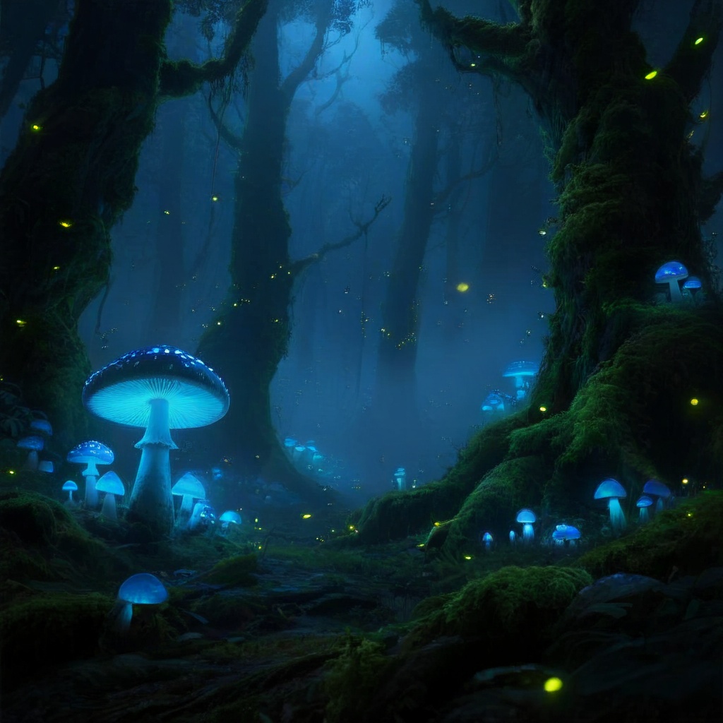 Bioluminescent forest at midnight, glowing blue mushrooms and fireflies, misty atmosphere, ancient moss-covered trees, fantasy concept art, matte painting style