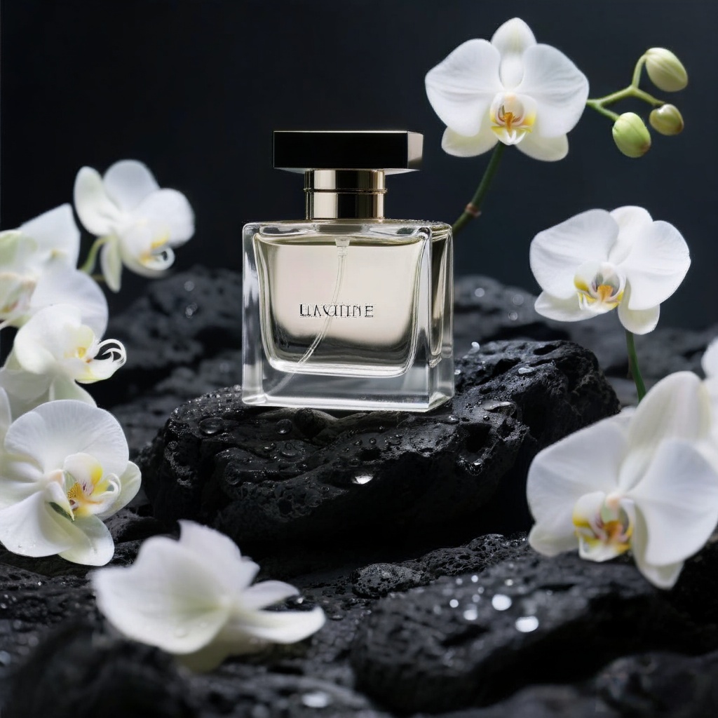 Luxury perfume bottle on black volcanic rock, surrounded by dewy white orchids, dramatic rim lighting, product photography, clean minimalist composition, 4k