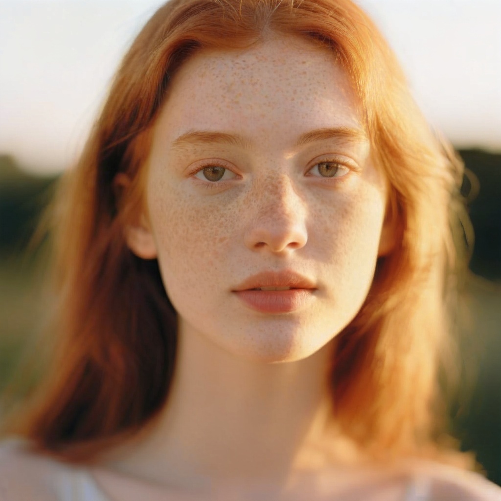 A young woman with freckles and auburn hair, soft golden hour lighting, shallow depth of field, shot on 85mm lens, natural skin texture, film grain, editorial portrait photography