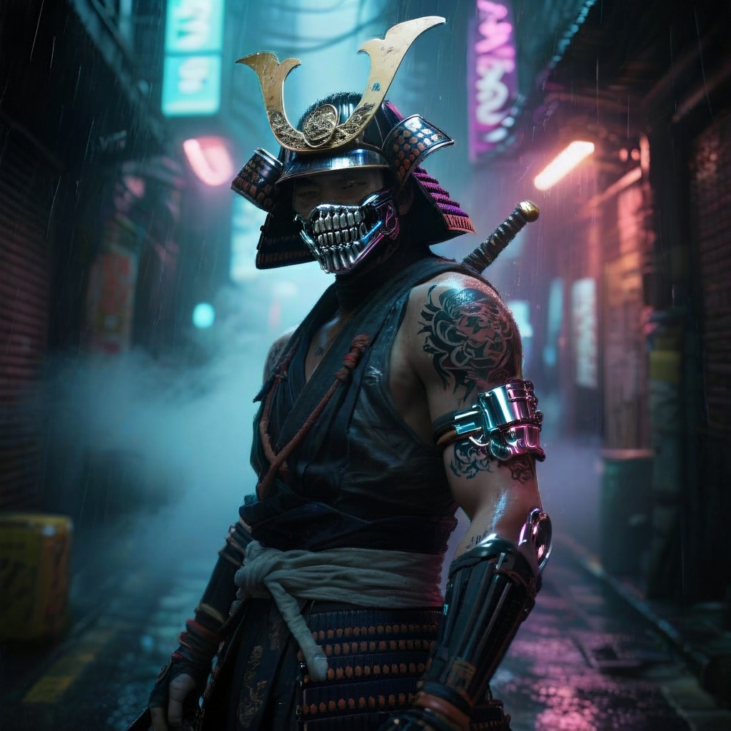 Cyberpunk street samurai, neon-lit rain-soaked Tokyo alley, glowing tattoos, chrome jaw implant, volumetric fog, cinematic lighting, hyper-detailed, 8k