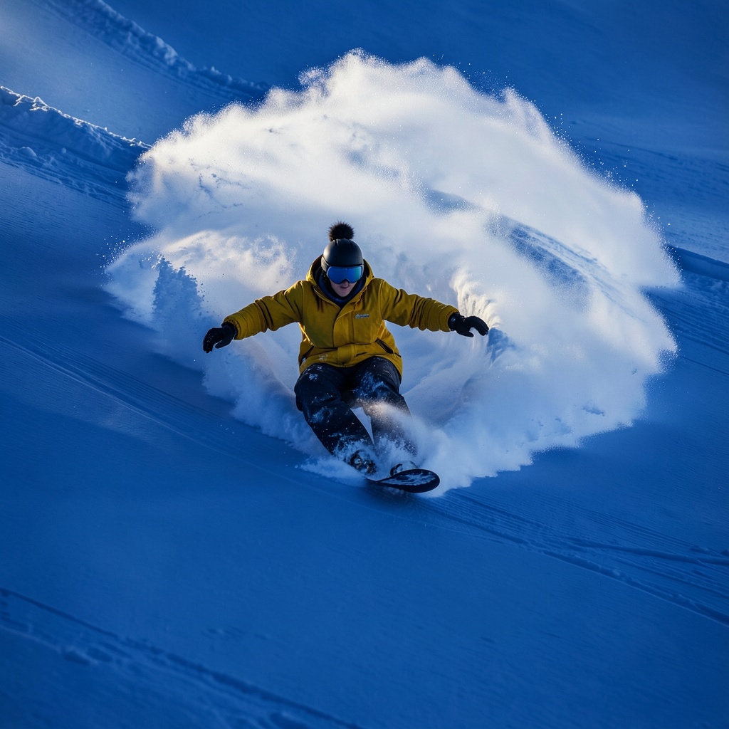 a snowboarder carving through powder, leaving behind an arc of white on the pristine surface of deep blue snow. award-winning photography, in the style of realistic photography.