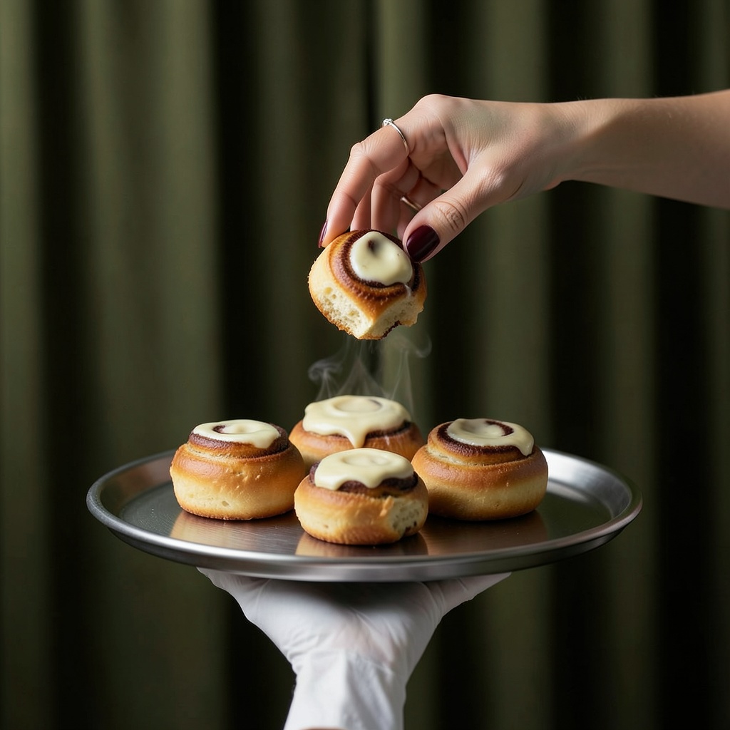 Luxury brand editorial photograph, identical composition and color mood, deep olive-green fabric drapery background with soft vertical folds, same tone and texture, theatrical studio setting, a white-gloved hand from below holding a round brushed metal serving tray, perfectly centered, on the tray a minimalist arrangement of classic Cinnabon cinnamon rolls, warm golden-brown dough, thick cream cheese icing, subtle steam, above the tray an elegant female hand with dark red manicure and delicate ring gently reaching down to take one cinnamon roll, frozen refined gesture, identical lighting direction, soft cinematic shadows, muted luxury color palette of olive green, cream, brown and silver, high-end fashion brand aesthetic, museum-like stillness, realistic photography, no illustration, no CGI, no cartoon, vertical composition
