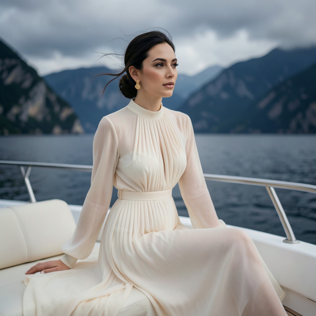 elegant woman sitting on the front of a yacht, flowing ivory chiffon gown with long sleeves and high neck, soft pleats, cinched waist, fabric blowing in the wind, cinematic fashion photography, moody overcast sky, dramatic mountains and cliffs in the background, lake or sea setting, calm luxury atmosphere, natural makeup, gold statement earrings, dark hair in a low loose updo, editorial Vogue style, shallow depth of field, soft natural light, muted colors, ultra realistic, high detail, 85mm lens