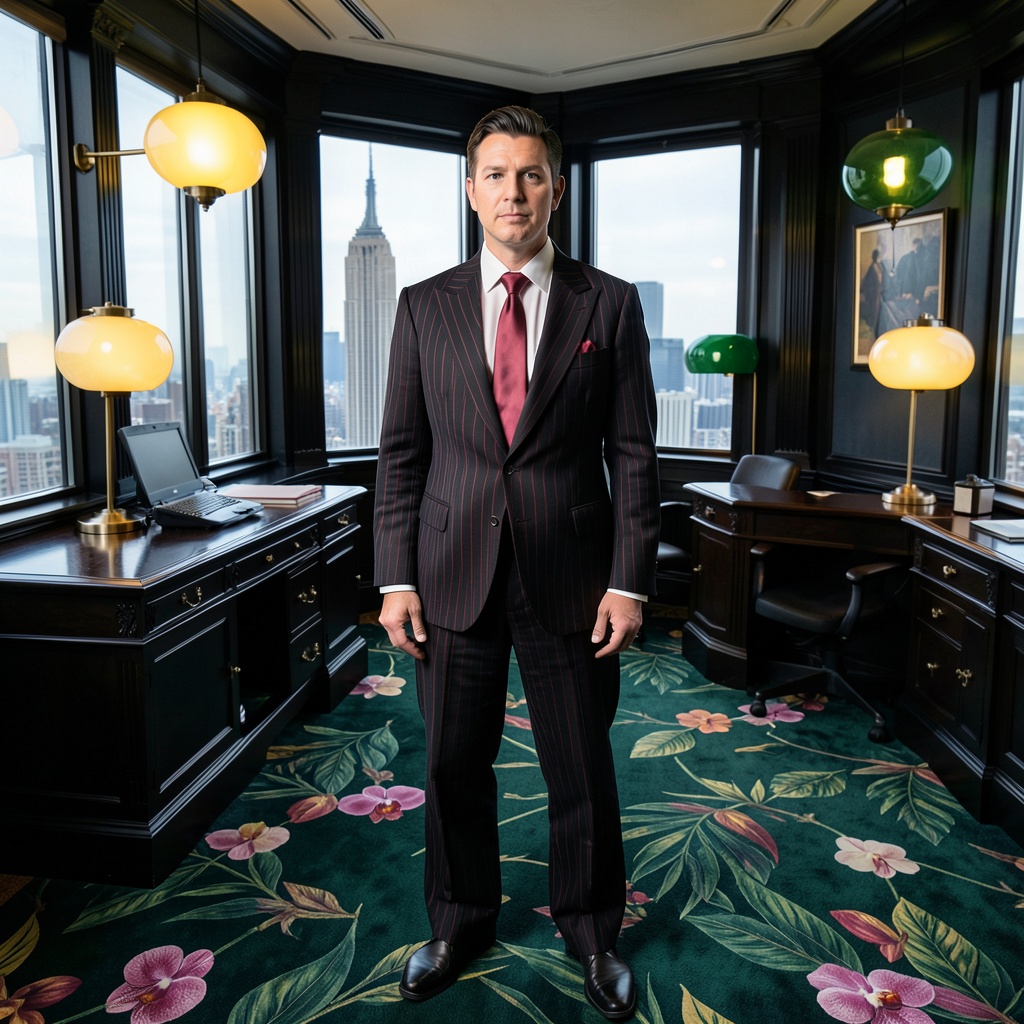 a photograph in the style of Annie Leibowitz powerful 30 year old businessman in a thick black gabardine baggy deconstructed Yohji Yamoto suit with red pinstripes, white shirt with round collare and a thick short crimson satin tie in a top floor Art Deco style Office on the Empire State Building, decorated in a palette revolving around #7852A9 by David Hicks. All wood is black ebony and all lamps have modernist round glass shades in complementary tetradic yellow or green. The silk carpeting is in a complementary emerald shade with a psychedelic orchid leaf print --no distortion, fabric lampshades