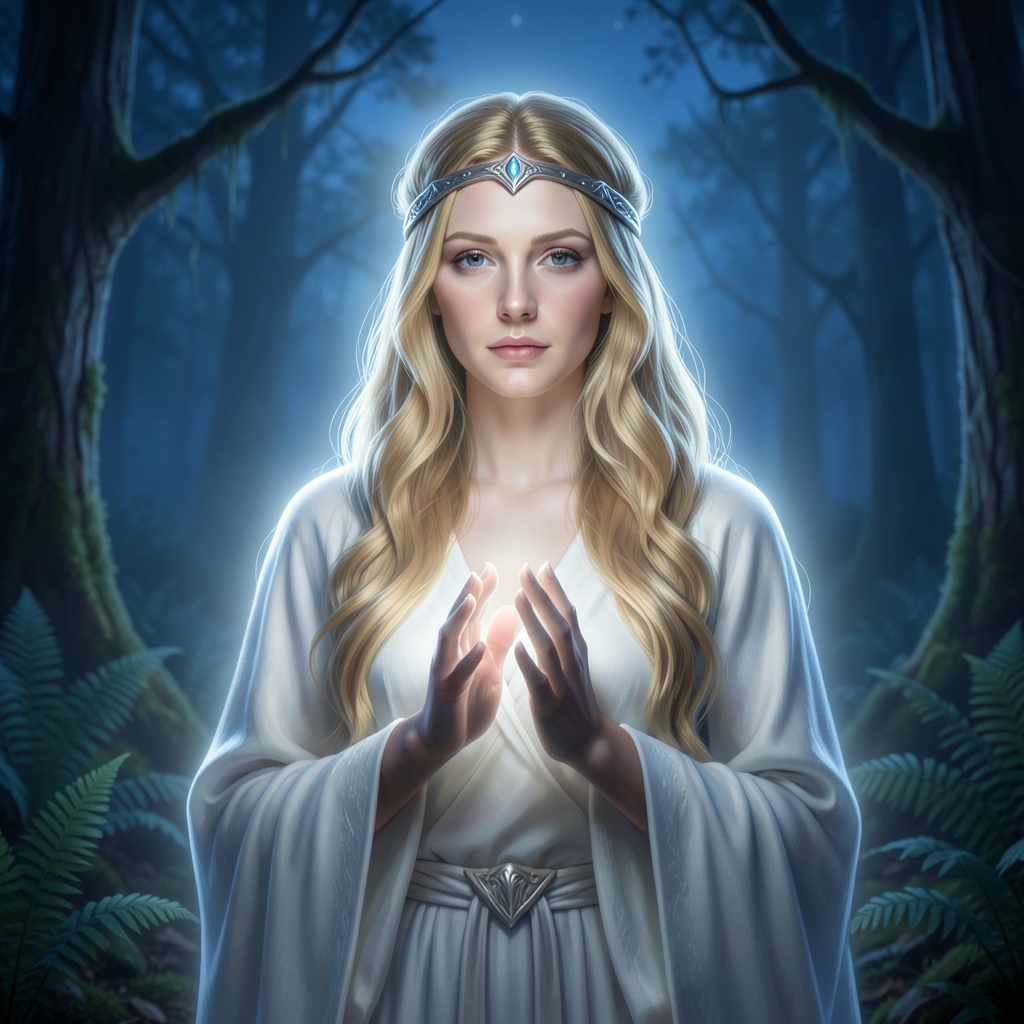 Core Theme: A divine close-up of Galadriel, the Elven Queen from "The Lord of the Rings," set in an elven sanctuary in a dark forest at night, combining elegance, purity, and solemn divinity. Character Details: Faithfully recreating Galadriel’s image long golden curls, a white, flowing elven robe (with soft, draping folds), elven-style headband accessory; hands raised in a solemn gesture, emanating a gentle white glow, with a serene and ethereal expression, fully conveying the divine aura of elven royalty. Scene Elements: A dimly lit forest at night, with a deep blue night sky as the background, surrounded by trees and ferns, creating a tranquil and secluded woodland atmosphere. Lighting and Mood: Cold blue nighttime tones as the base, with the character emitting warm white light to create a soft contrast between light and shadow; the light is hazy and envelops the divine presence, producing a solemn, ethereal, and sacred mood. Art Style: Movie-level realistic texture inspired by "The Lord of the Rings," in a fantastical epic cinematic style, with ultra-detailed rendering (robe textures, hair gloss, light diffusion), delicate realistic brushwork, medium-close-up perspective (highlighting the Elven Queen’s divinity and elegance).