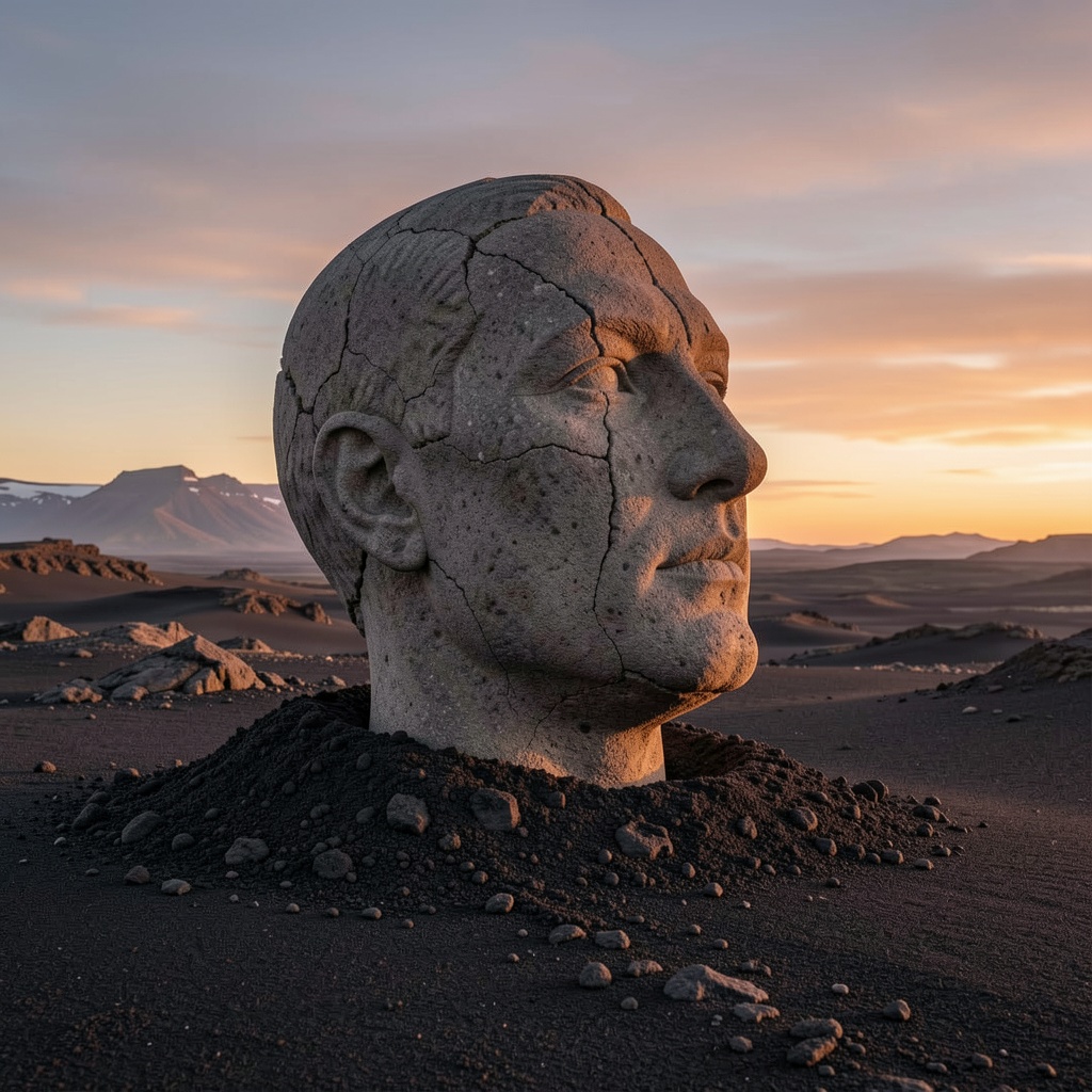 head made of stone of the big art deco sculpture buried in half in icelandic ash on the black desert, late sunset light, intrinsic, photorealistic