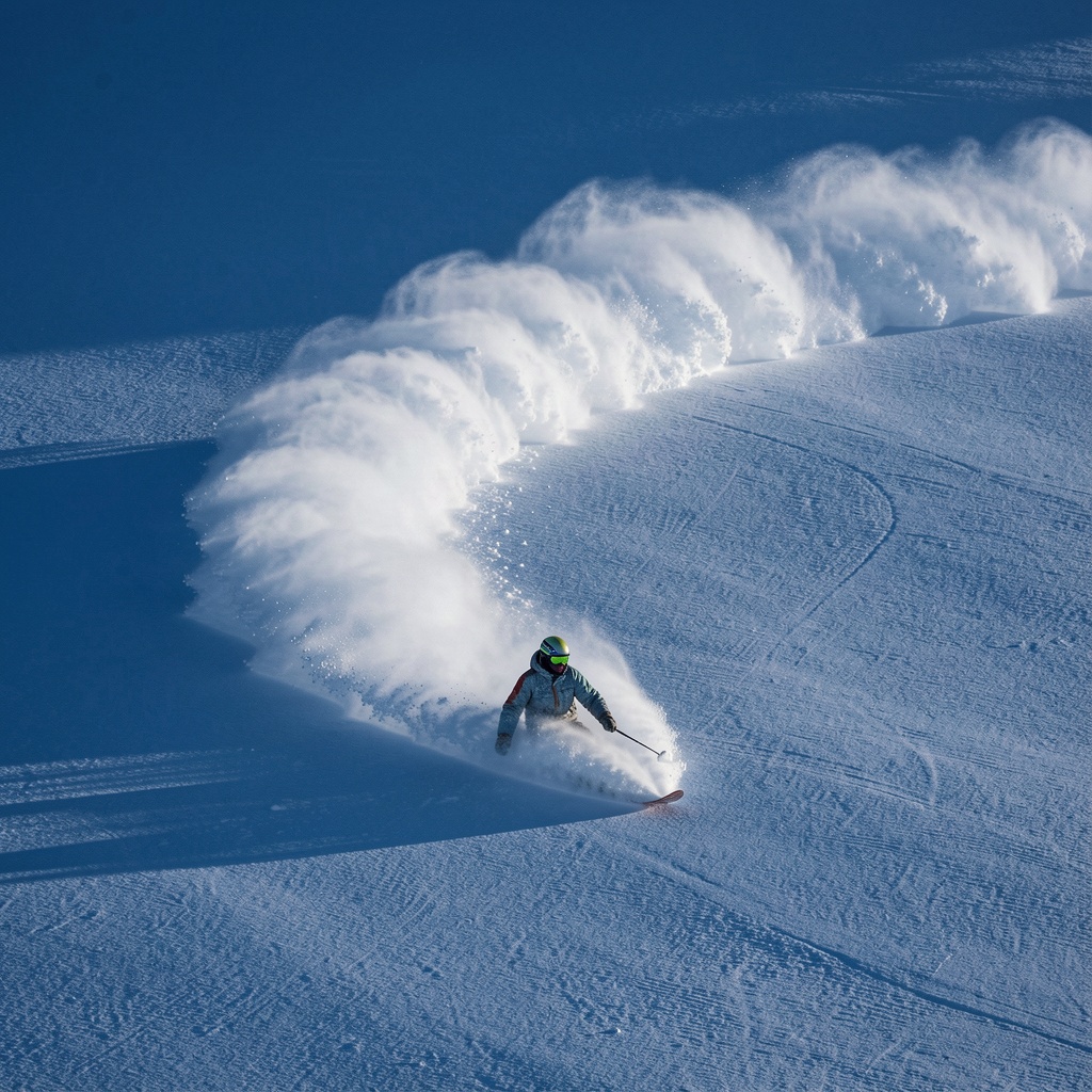 a snowboarder carving through powder, leaving behind an arc of white on the pristine surface of deep blue snow. award-winning photography, in the style of realistic photography.