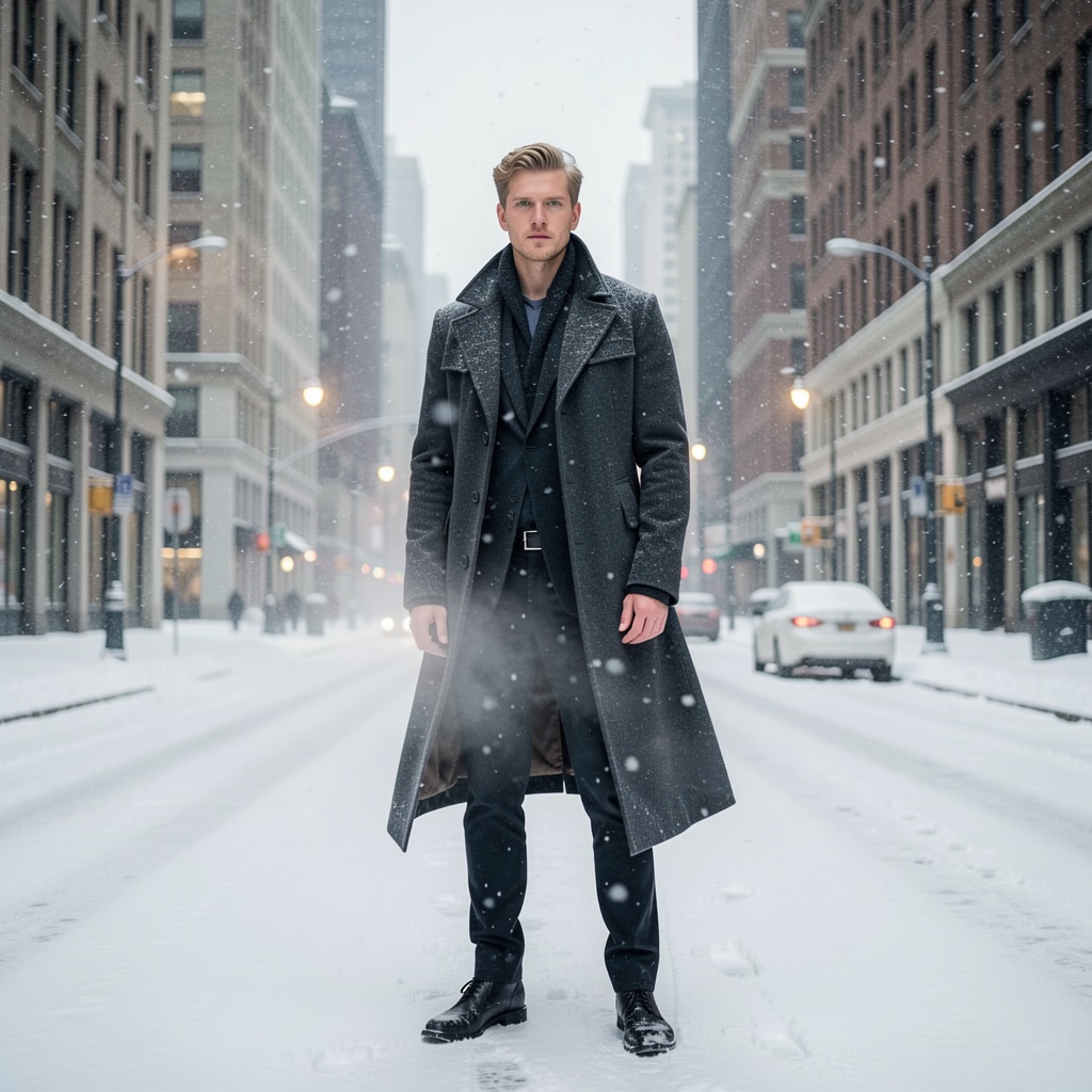 A full-body editorial fashion photoshoot featuring a white male model with green eyes, standing on a wide city avenue lined with tall urban buildings in winter, heavy snowfall dominating the scene, snow-covered streets and sidewalks, icy air visible in breath, overcast winter sky with soft diffused daylight, cool muted color palette, cinematic lighting with gentle rim light through falling snow, high-fashion winter wardrobe with structured silhouettes and flowing fabrics, wind-driven snow adding motion, elegant and dramatic mood, ultra-realistic photography, shallow depth of field, subtle bokeh background, Vogue-style editorial aesthetic, atmospheric urban winter setting