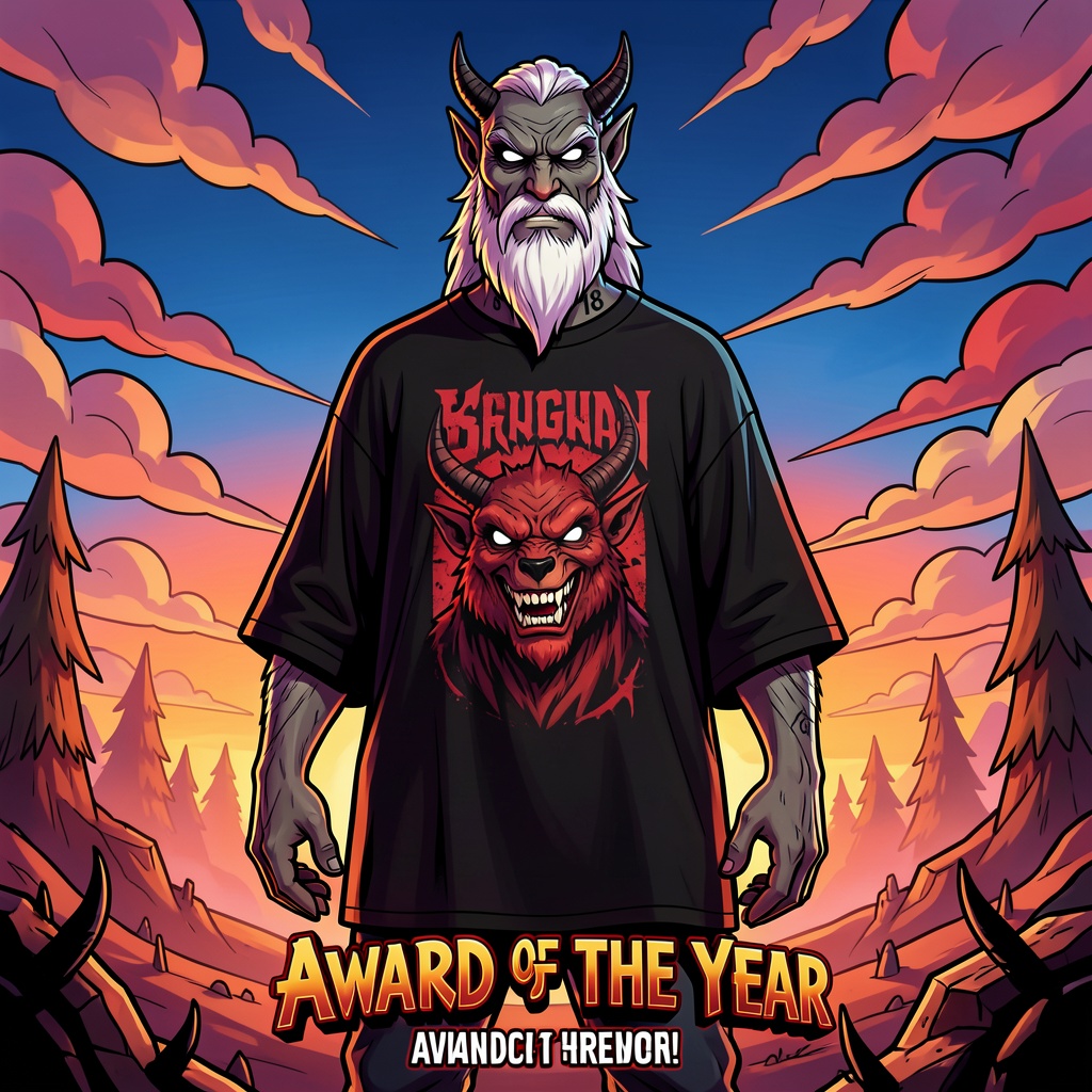 full body Animation Cartoon werewolf man with long white beard wearing black drop shoulder oversize Graphic T shirt and , satan demonic style , evil mode, white eyes, tattoo number 18 on neck , looking to the eyes the sky, concept artt, award of the year, wide view, insanely detailed, comic 3d Render, thick outline stroke , poster style,vivid background