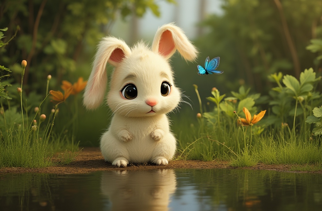 Animate a front-facing 3D bunny character (Bolota) sitting near the edge of a calm, mirrored lake. The bunny slowly blinks and lowers his head slightly in a sad expression. A gentle blue butterfly flutters slowly from the background, circles once, and lands softly on the bunny’s nose. After a second, Bolota slightly lifts his head and his ears perk up a little as his eyes widen with gentle surprise. Subtle water reflection ripples below. Soft breeze moves the leaves in the background.