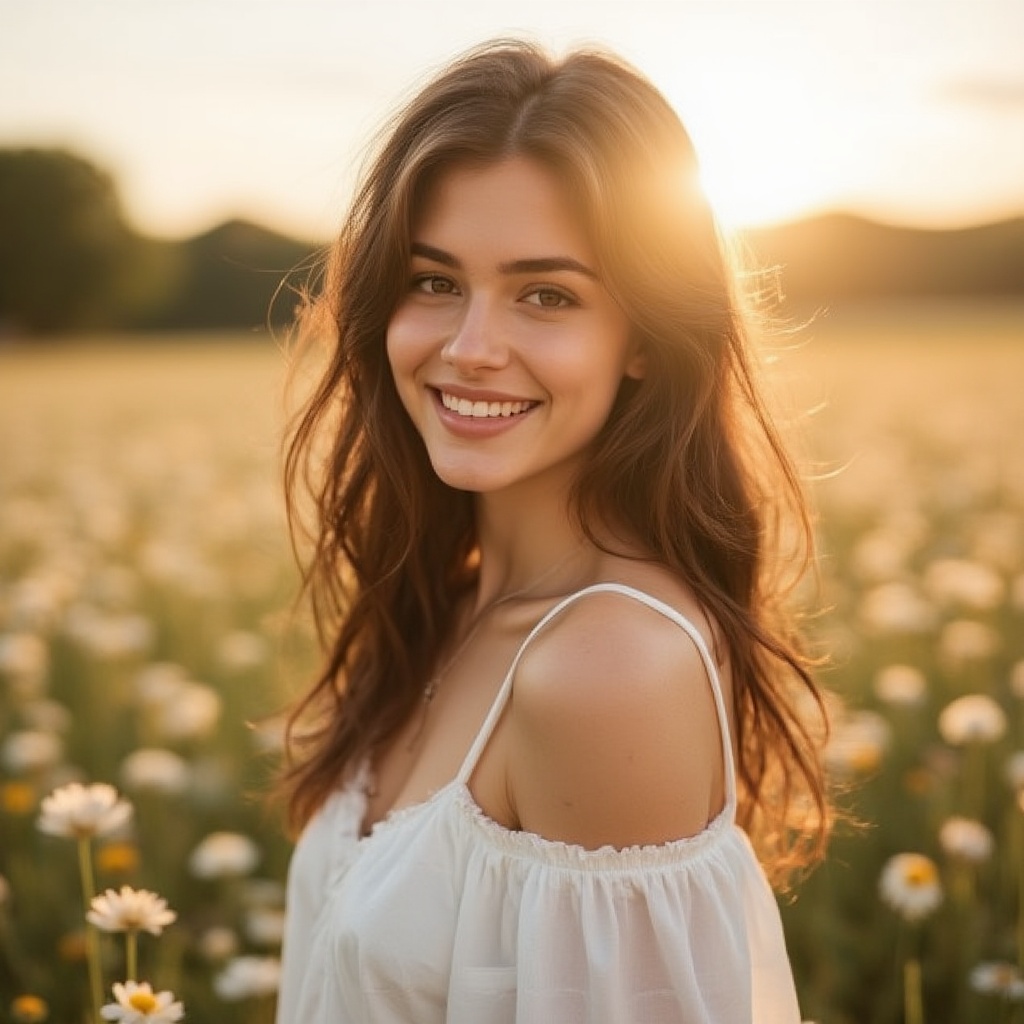 a beautiful young woman in a white dress, smiling under the morning sun, ultra-realistic, glowing skin, soft natural lighting, flower field background, pastel tones, shallow depth of field, detailed eyes, cinematic bokeh, high-definition photo
