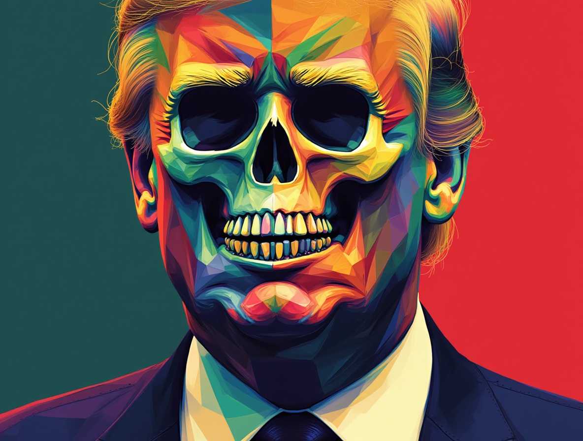 geometric tall character design, in the style of TTLDRMCHR. Donald Trump and a mexican skeleton, vibrant color background