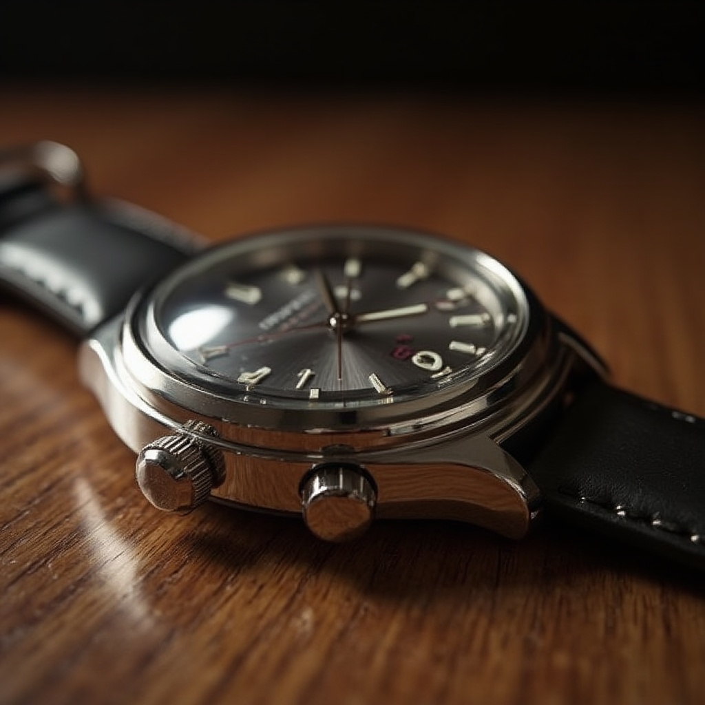 a luxury wristwatch on a wooden table, ultra-realistic, macro photography, precise metal reflections, shallow depth of field, studio lighting, product photography, cinematic detail, 4k render