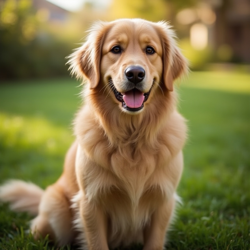 a golden retriever sitting in a garden, looking at the camera, ultra-realistic fur detail, bright lighting, soft grass background, cheerful mood, warm tones, cinematic focus, natural environment, high-resolution animal portrait
