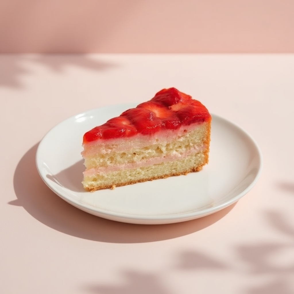 a delicious slice of strawberry cake on a white ceramic plate, morning light, ultra-realistic texture, soft shadows, bright background, shallow depth of field, pastel aesthetic, product photography, high-detail realism